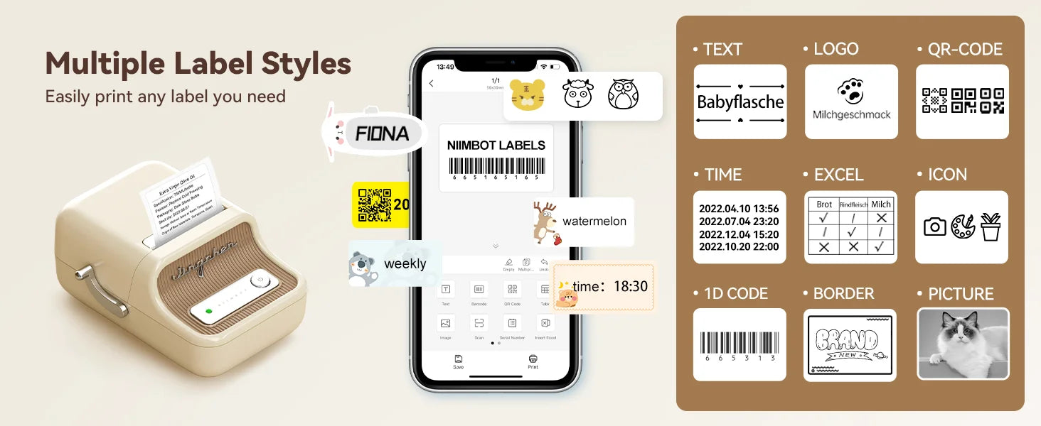 NIIMBOT APP functions like automatic templates matching, image recognition, batch printing are offered,also includes more than 20 kinds of fonts and thousands of image materials.