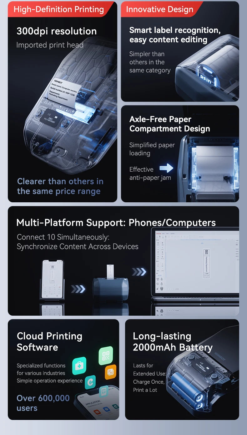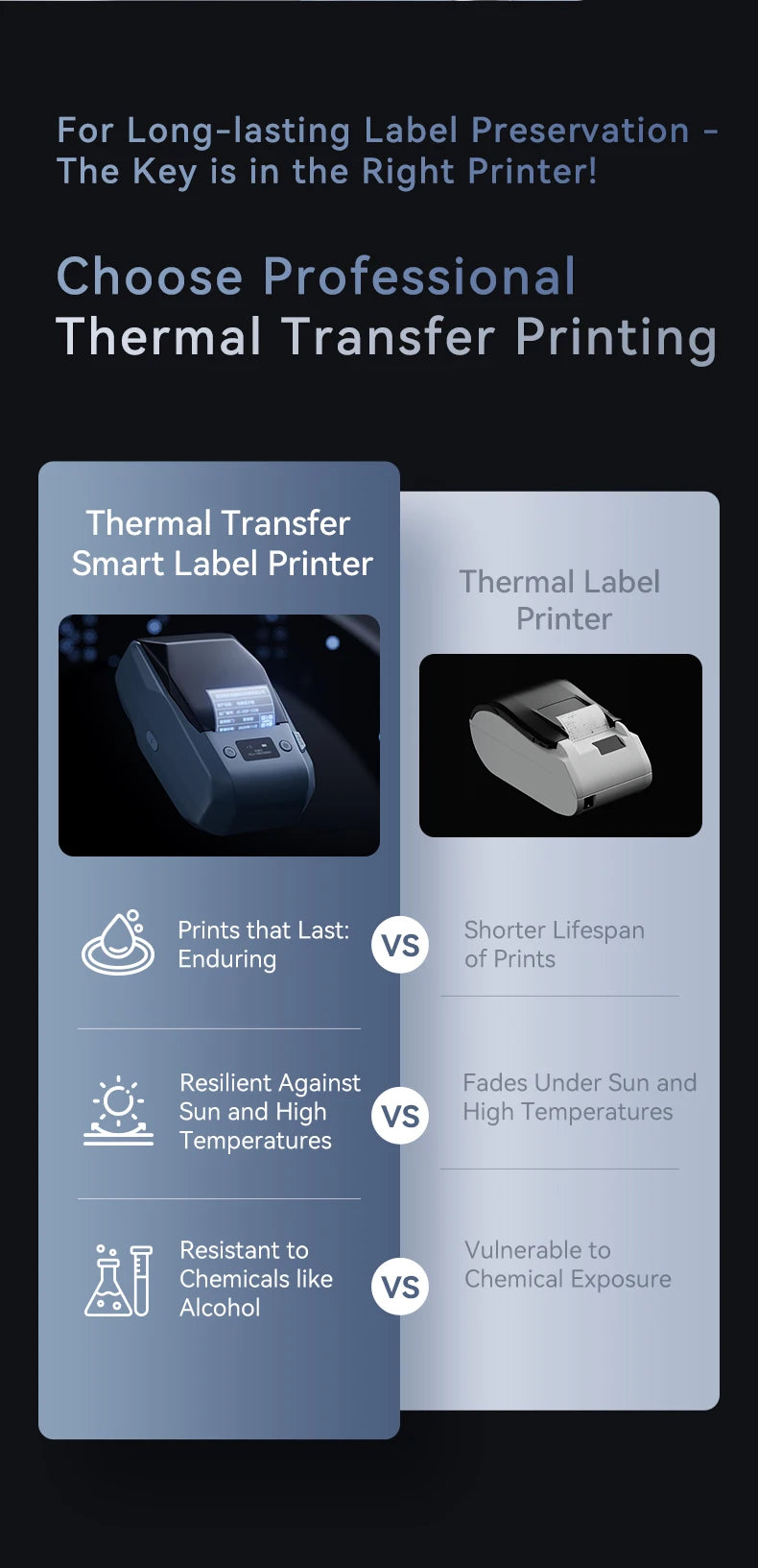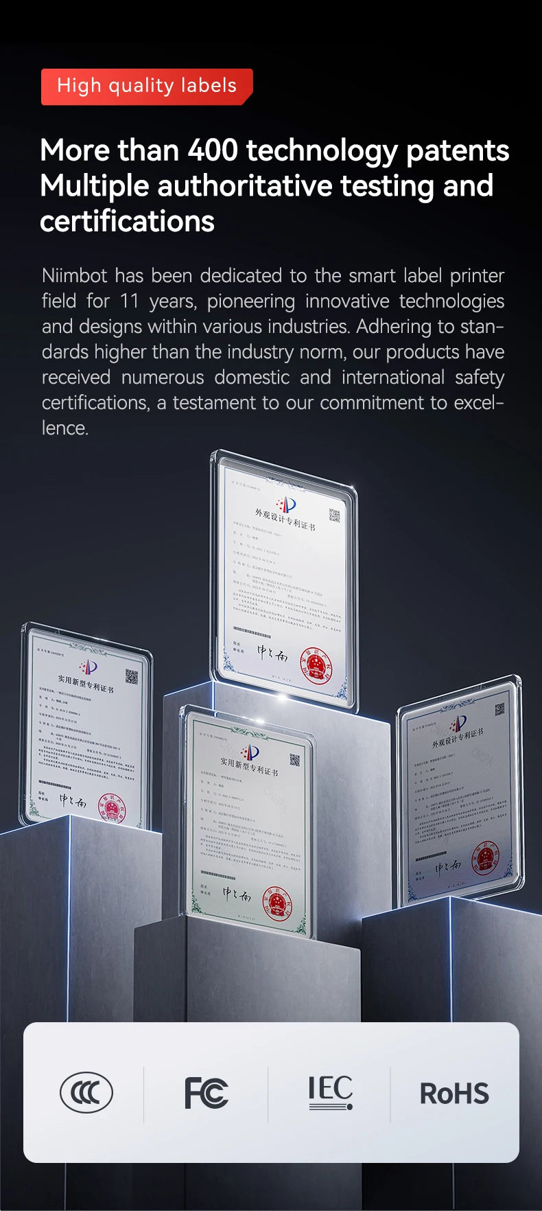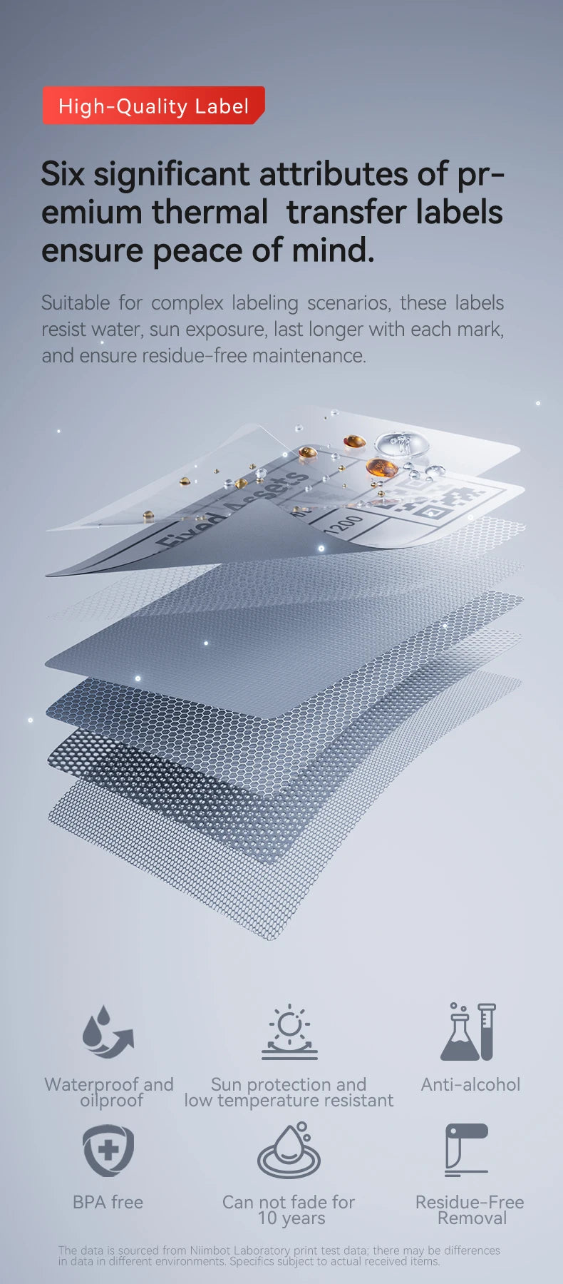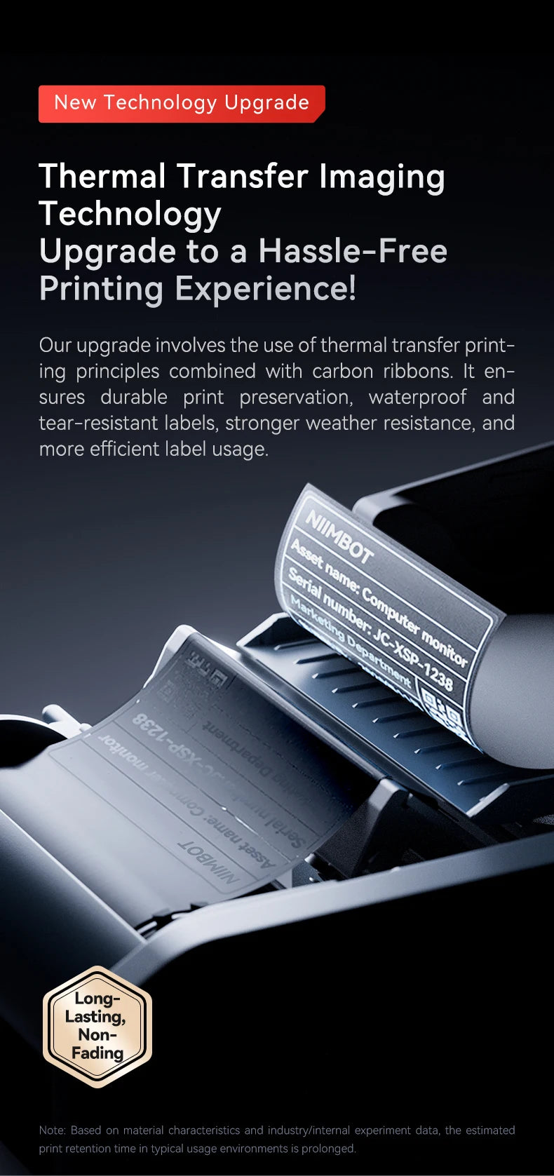Thermal Transfer Enhancement Technology - NIIMBOT M2 bluetooth label printer adopts thermal transfer enhancement technology with 300 DPI. Compared with thermal printers, labels can be stored longer, are waterproof, oil-proof, alcohol-proof, wear-resistant, and scratch-resistant, and can withstand high and low temperatures, thereby overcoming the limitations of short storage time of thermal labels.