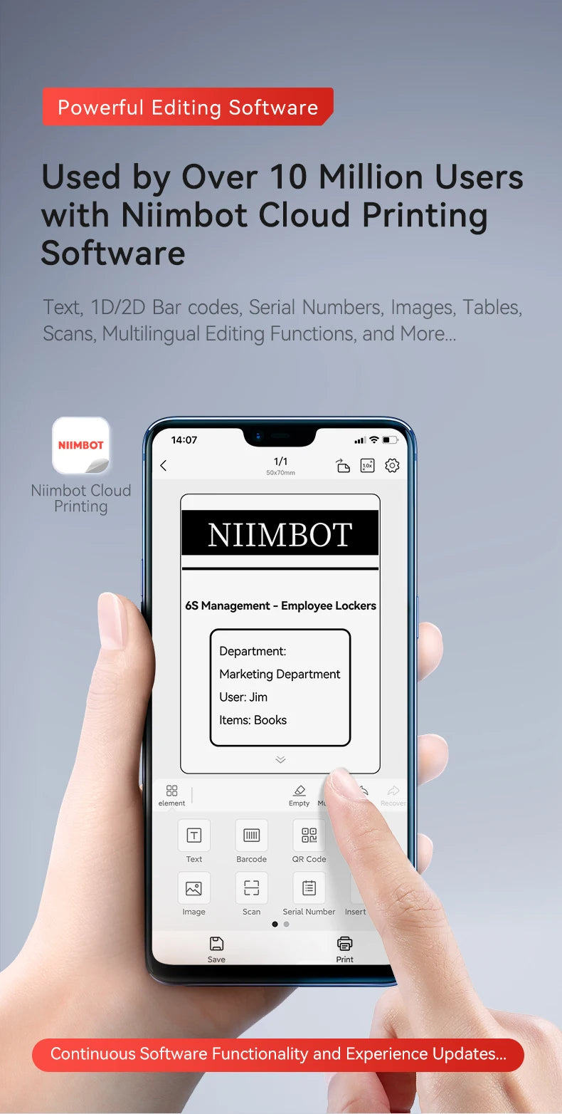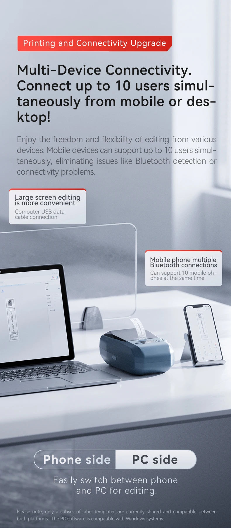 Support Mobile and PC Editing -- ''NIIMBOT APP'' smart bluetooth connection to create personalized labels anywhere, can support 10 mobile phones simultaneously (3 IOS, 7 Android), you can also connect to computer via data cable (required driver installation) for more diverse content editing, can switch freely between the two ends.