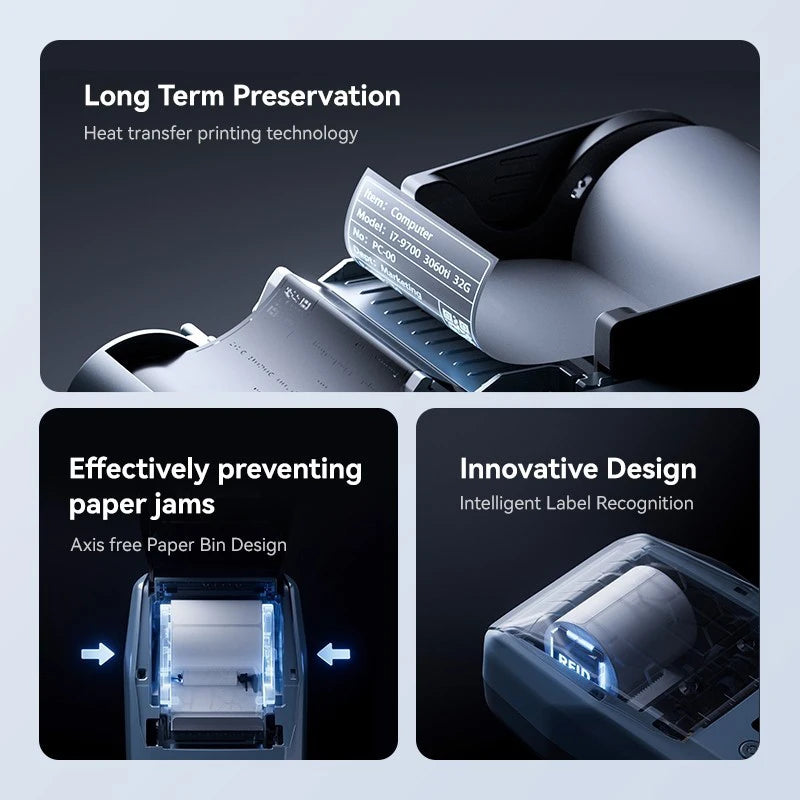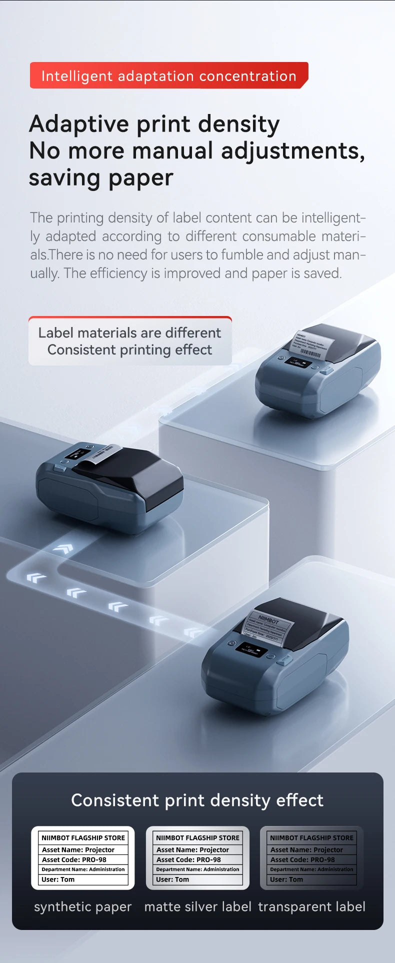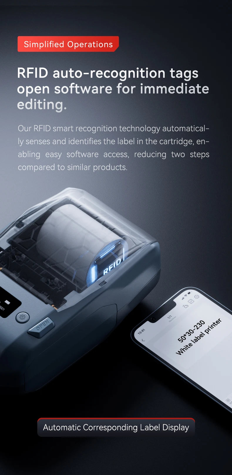 Smart Introduction--Various types of label paper, you can match as you like to create the printing effect you want. 20-50mm print width, intelligent consumables recognition, automatic paper return and proofreading function are excellent for helping users save labels and time. Printing density is adaptive according to different labels, thereby increasing efficiency.