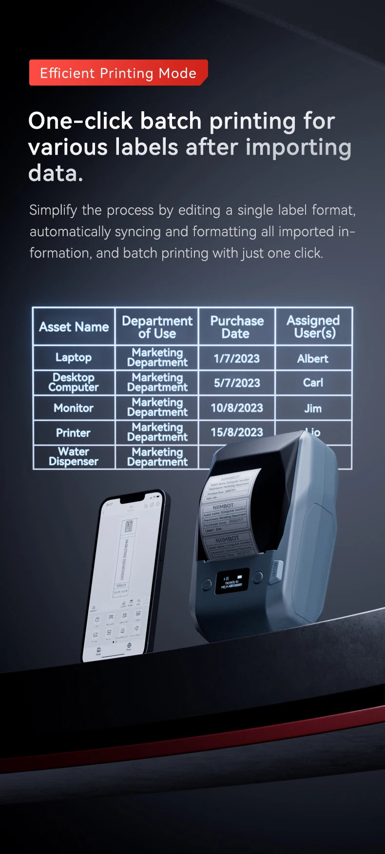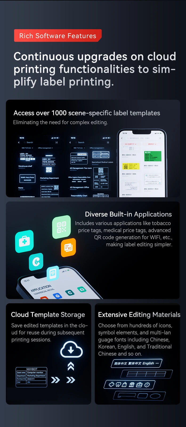 Various Creative Templates -- The wireless Bluetooth connected NIIMBOT APP contains multi-industry templates, texts, Icons, tables, logos, barcodes, QR codes, images, times, Excel inserts, Scans, Voice RECGs and more. You can easily create various design label stickers from the App. Support batch printing of same/different commodity labels, easy to use and efficient.