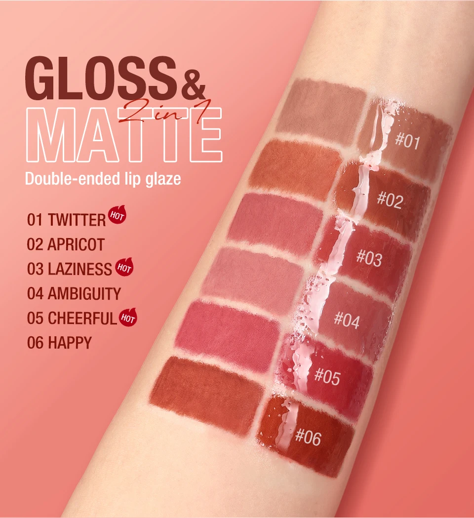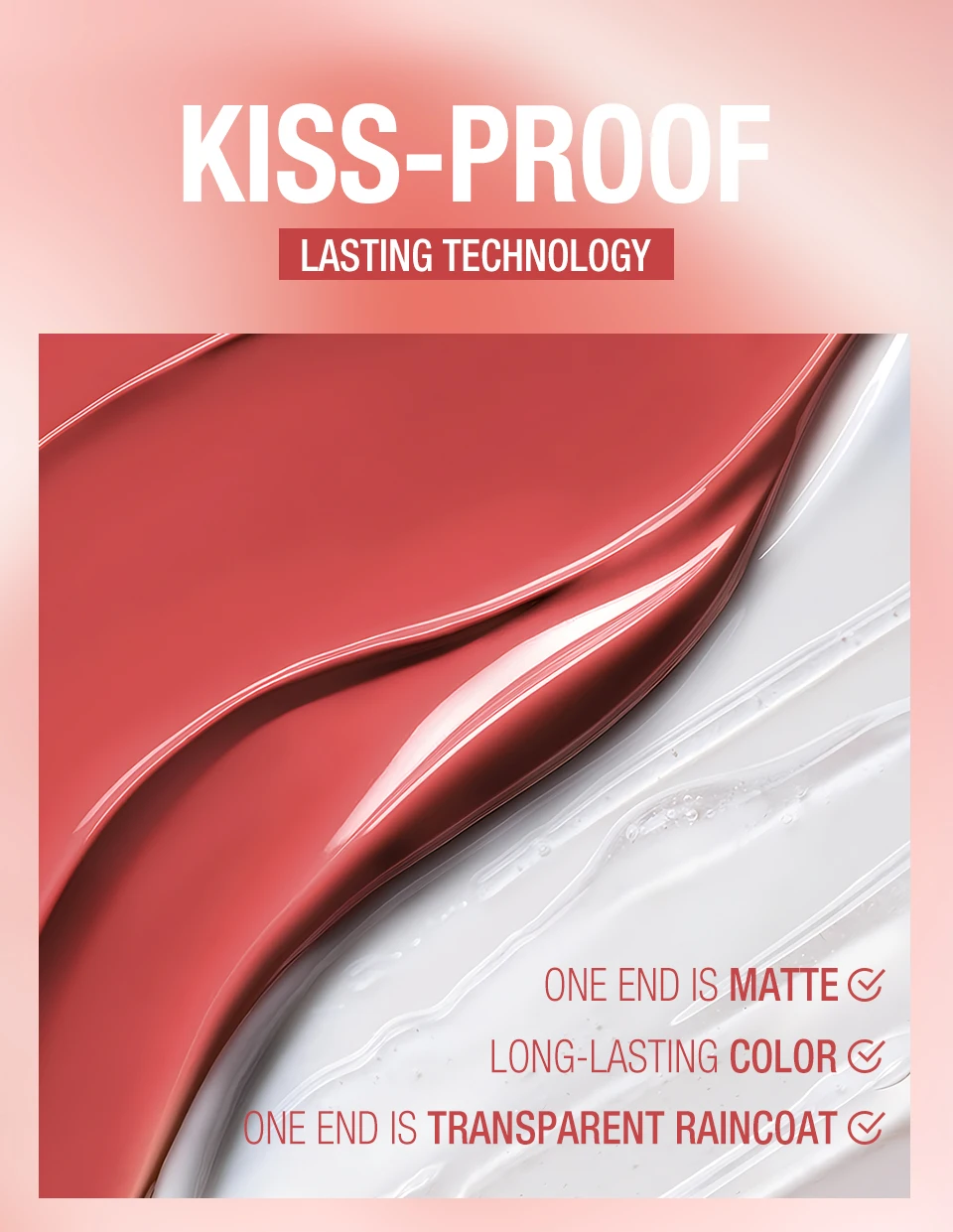 Do you want to one lipstick get doll your lips in creamy, shiny,long lasting perfection? Try our Dual-effect lip makeup with long-lasting color.One end is a non-stick matte lip glaze with a color-locking formula, and the other end is a transparent raincoat lip oil to create a shiny and full lip makeup.