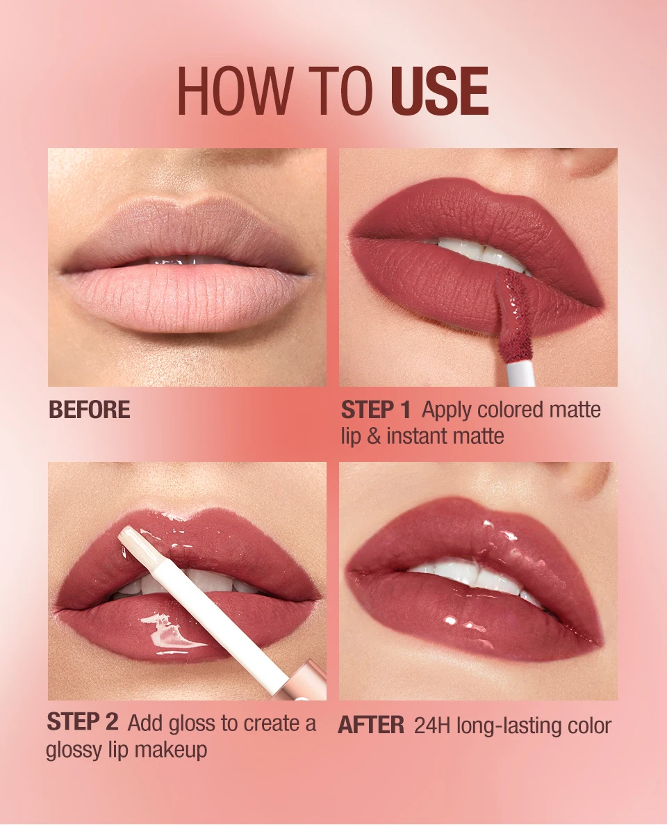 💕【Easy 2-Step Application】Simply pair the high-pigment base coat, infused with lip-loving oils with the ultra reflective and non-sticky top coat for the loudest shine you've ever seen with no budge, no bleed and no fade.