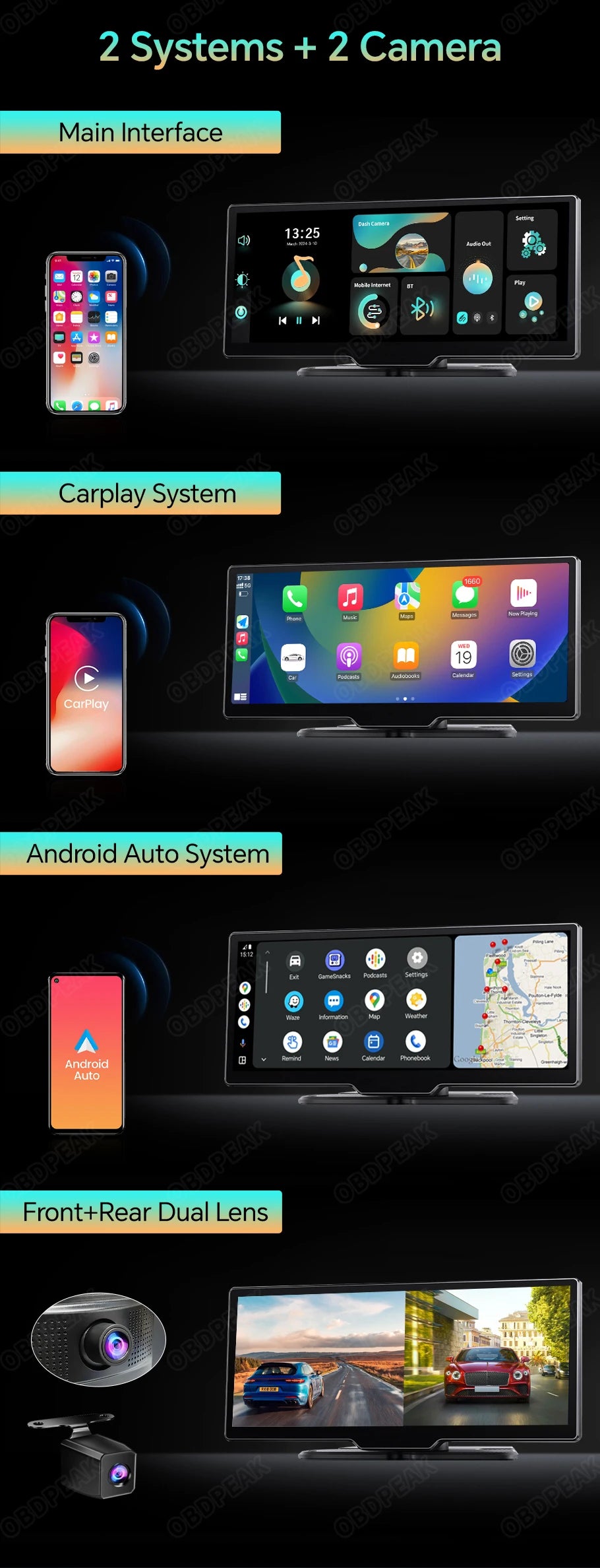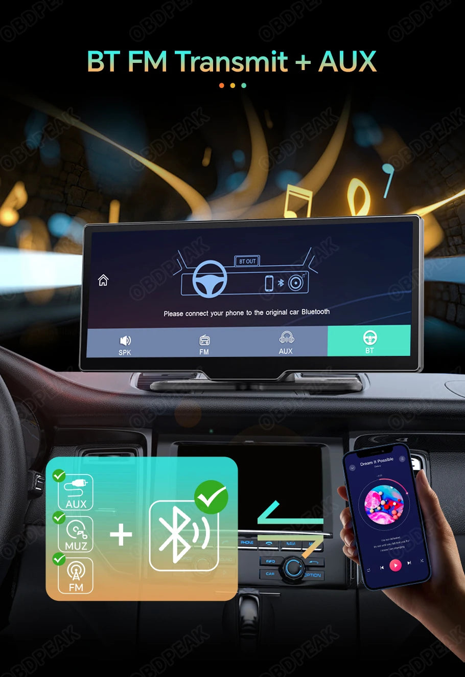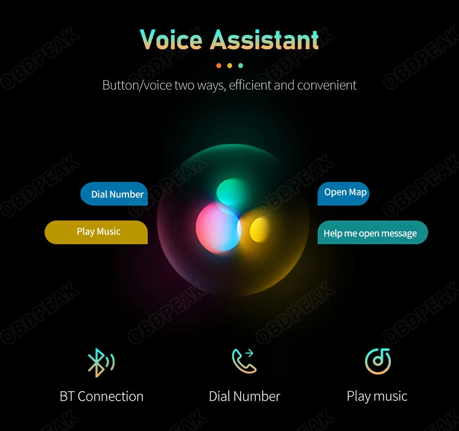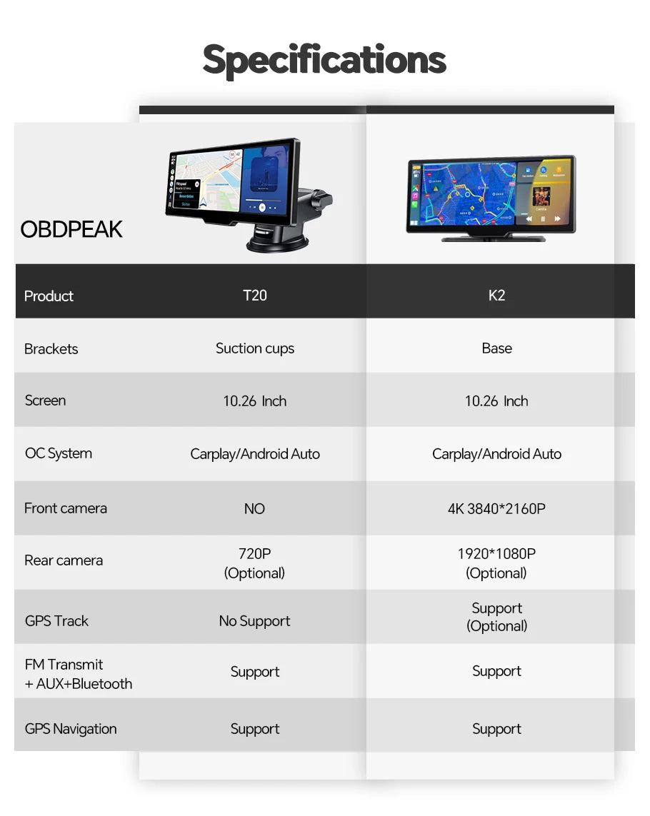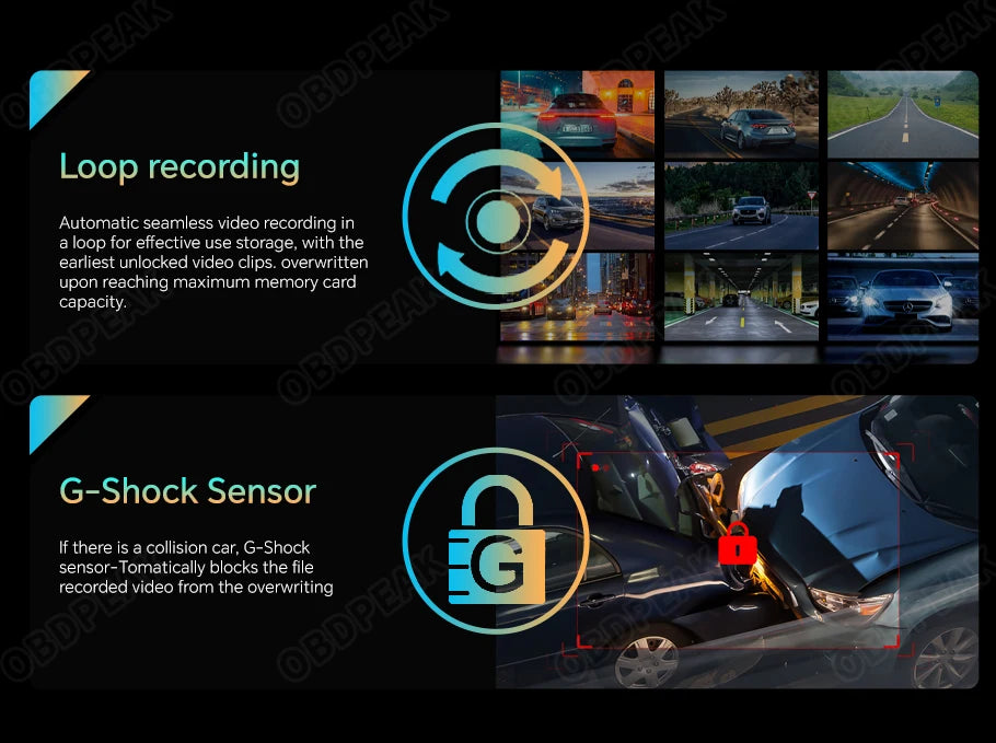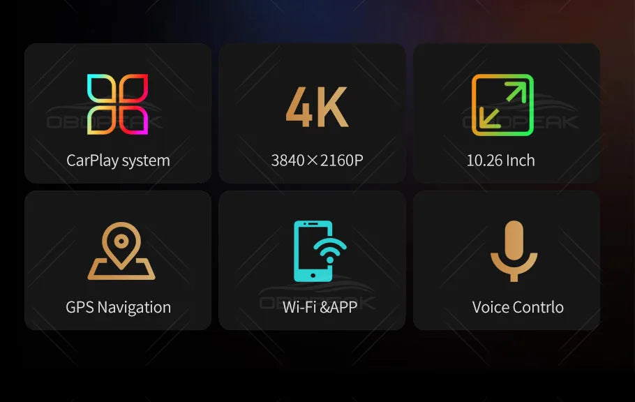 The OBDPEAK K2 recorder uses the latest technology, supports Carplay and Android Auto functions, users can easily and safely make calls, listen to music, send and receive messages, use navigation, support Siri, and more. (Wireless Connections, via BT or WiFi)