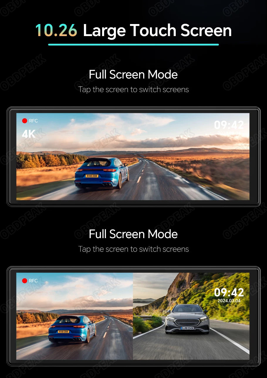 10.26 Inch ultra wide-angle full view touch screen, capturing license plates, road signs, and other critical details on the road. Very clear and smooth images display as like a stream flowing on the excellent WDR and auto adjusting brightness streaming mirror. Supports simultaneous 1:1 display of front and rear cameras. (The rear camera and cable require purchasing the dual lens option.)