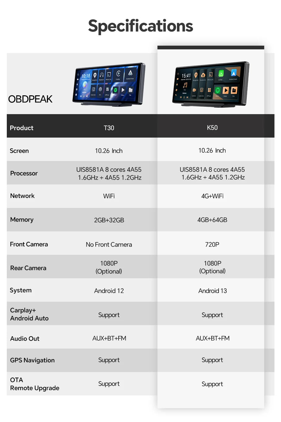 The OBDPEAK K50 has a crazy built-in 3 system, Android 13 system/Carplay system/Android Auto system, and has added an Dual Lens to meet all your car driving needs!