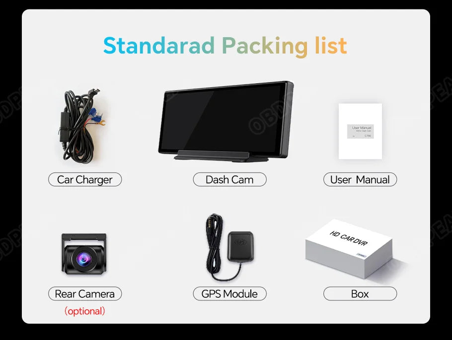 Special Features: G-Sensor,motion detection,sd/mmc card,Bult in GPS,Radar Detector,waterproof,Anti Vibration,Real Time Surveillance,Automatic White Balance,wifi function,bluetooth,Voice control,Parking Monitor,adas,Speed and Coordinates Recording,3D DNR,External GPS