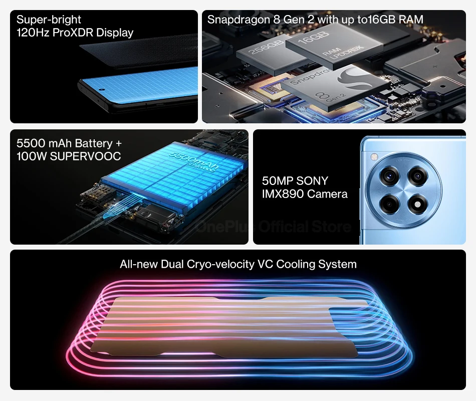 4th Generation LTPO 120 Hz ProXDR Display | 5500 mAh Battery + 100W SUPERVOOC | All-new Dual Cryo-velocity VC Cooling System | Qualcomm Snapdragon 8 Gen 2 | Up to 16GB LPDDR5X RAM | 50MP SONY IMX890 Camera