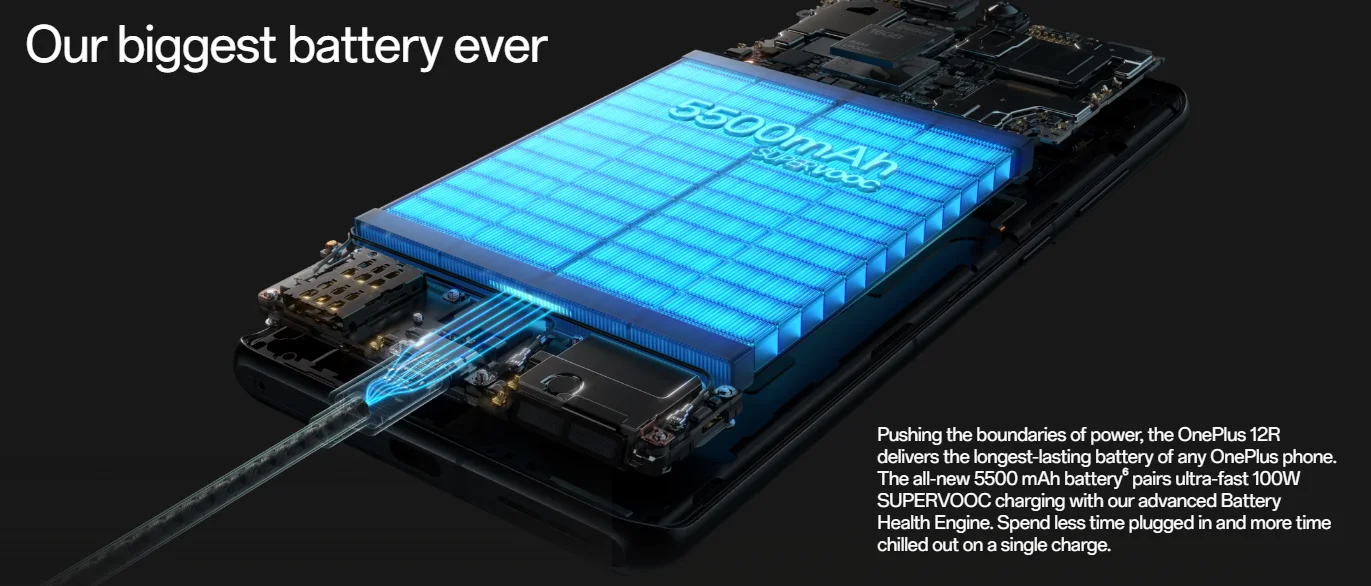 Pushing the boundaries of power, the OnePlus 12R delivers the longest-lasting battery of any OnePlus phone. The all-new 5500 mAh battery6 pairs ultra-fast 100W SUPERVOOC charging with our advanced Battery Health Engine. Spend less time plugged in and more time chilled out on a single charge.
