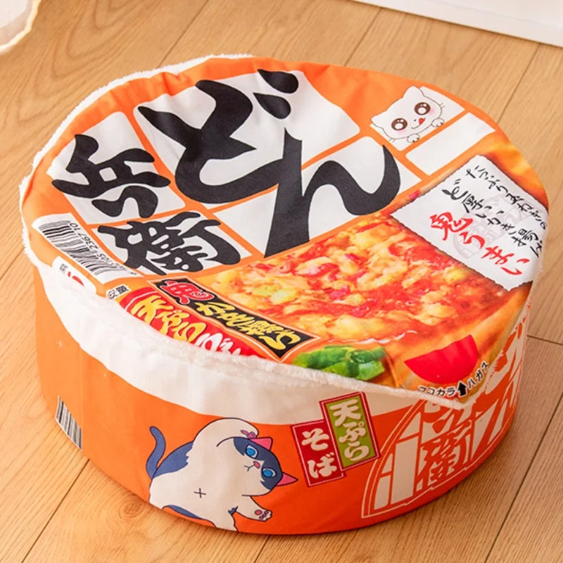 Super comfy and squishy! Comes with a fluffed fleece "ramen lid" and a plush ramen soup noodles cushion! With velcro fastenings.
