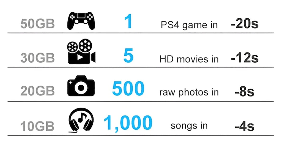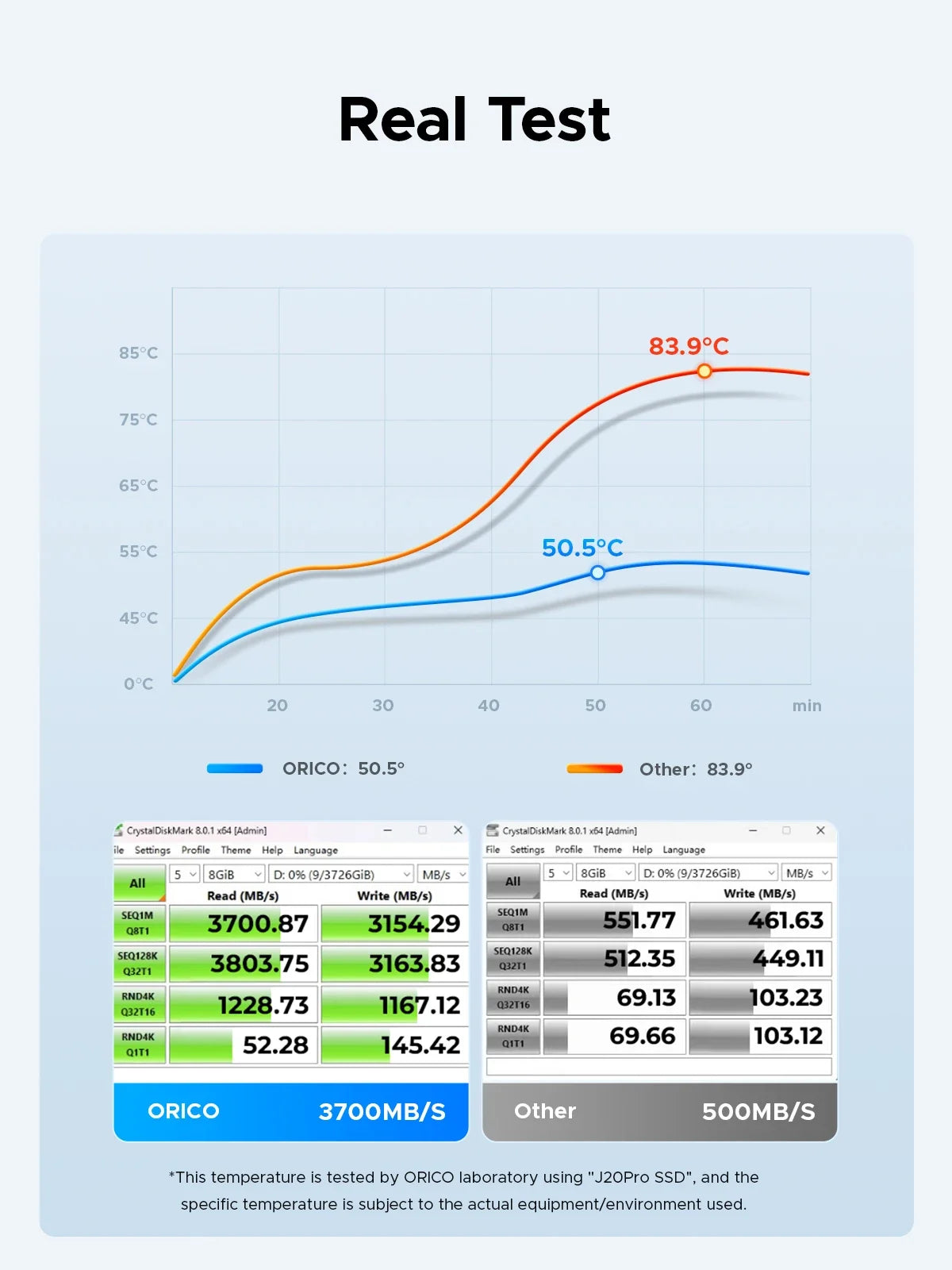 With USB4 Type C output interface, it supports the maximum transmission speed up to 40Gbps. The measured maximum continuous read speed can reach 3700MB/s, and the continuous write can reach 3100MB/s.(NOTE: Speed will be affected by ssd and computer performance)