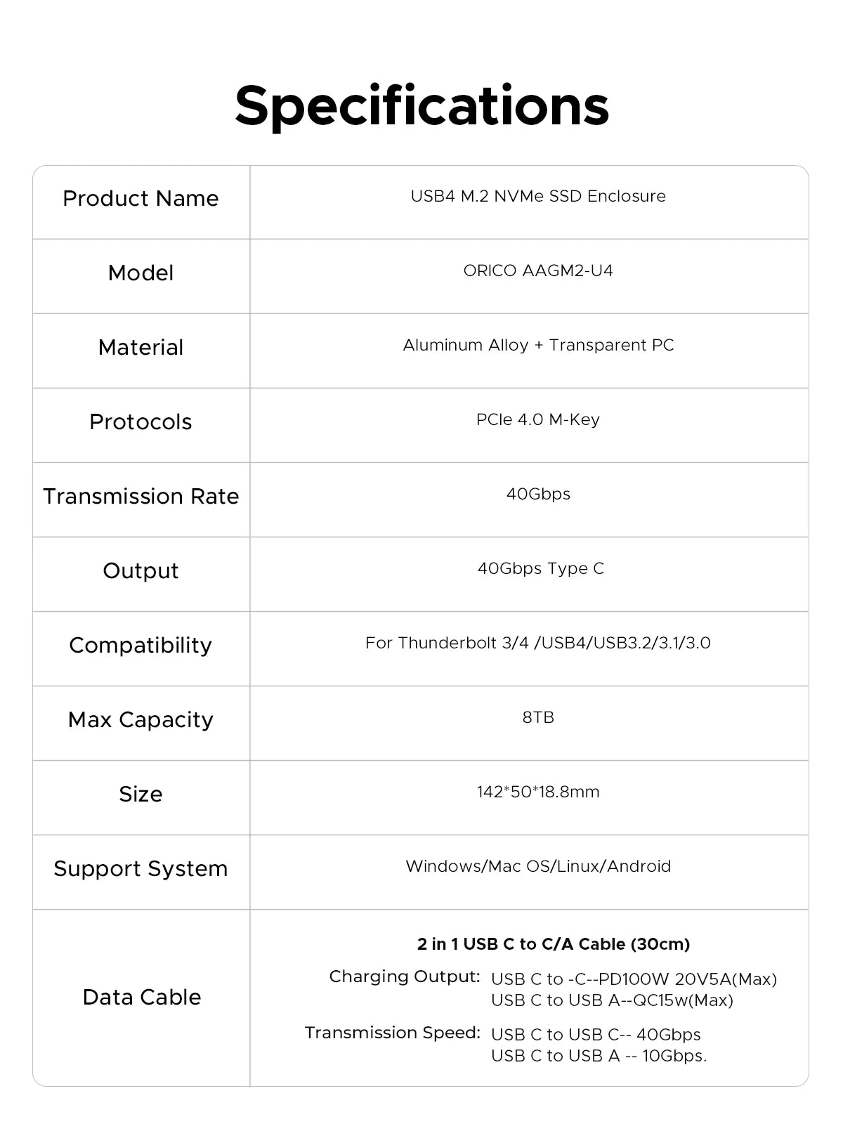Whether you are a designer, business traveler, photographer, videographer, or content creator, ORICO USB4 Enclosures allows you to confidently deal with large amounts of video, images, files, and digital data quickly and with ease. Expand your digital storage, making your work and life easier and more efficient.