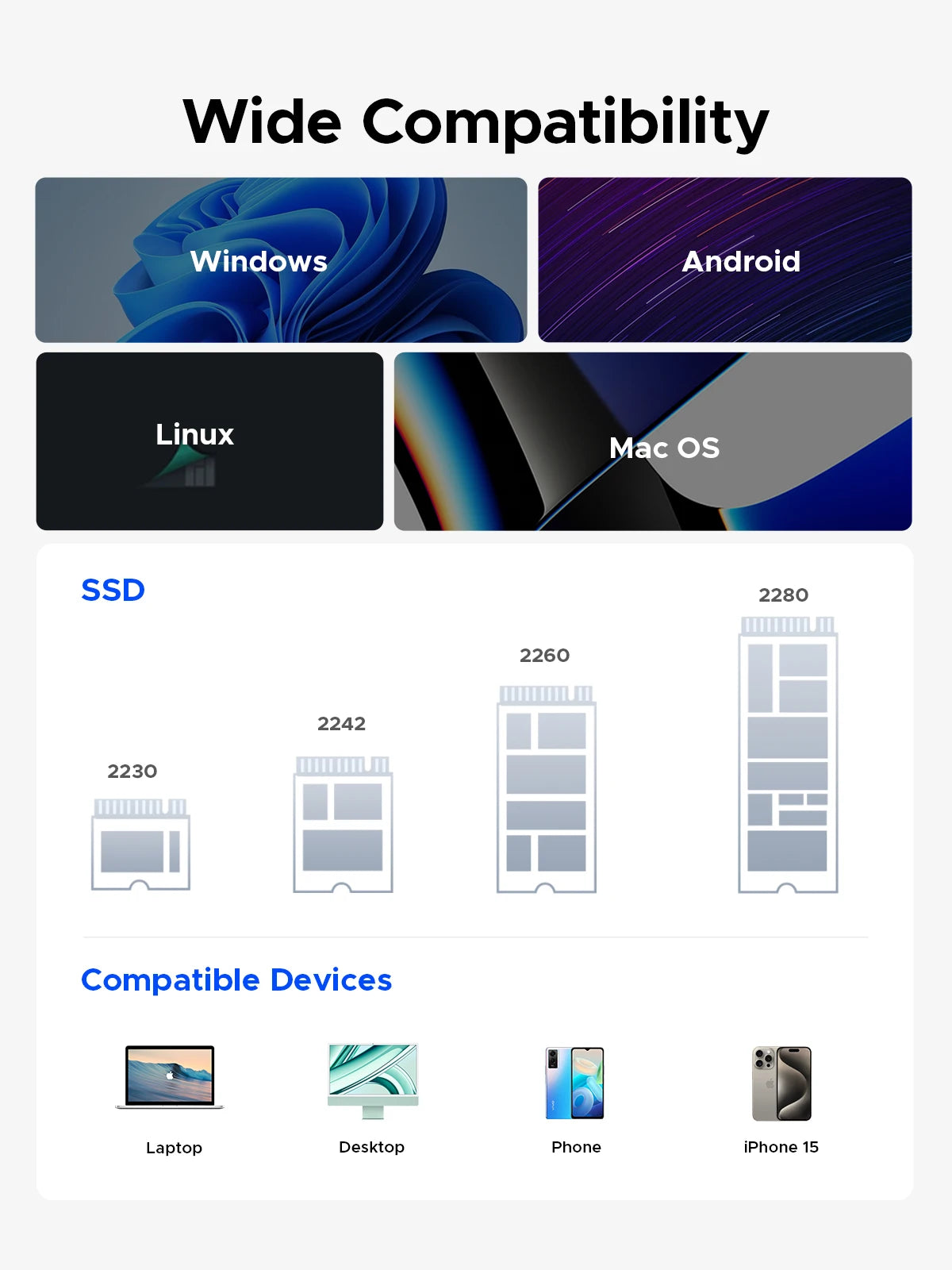 Compatible with NVMe SSD in sizes 2230/2242/2260/2280.such as M.2 NVMe M Key SSD.included the latest PCIe Gen 4x4 SSD.
