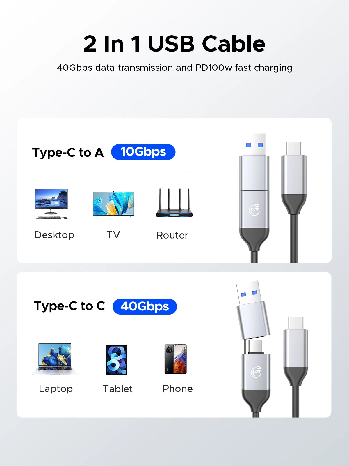 40Gbps data transmission and PD100w fast charging.NOTE:The included USB cable has 2 output ports, USB C to A (10Gbps/QC15W) and USB C to C (40Gbps/PD100W)