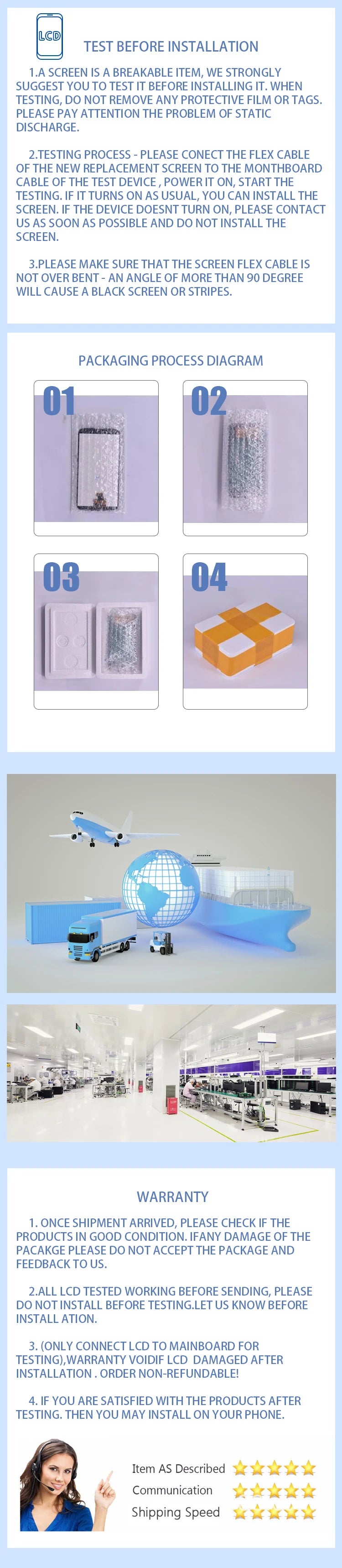 1. installation: it is recommended to use special tools and perform professional operations. 2. before placing the order: check your phone model and carefully read the corresponding information. 3. before installation: as the screen replacement is fragile, it is best to try this. 4. test process: first, connect the new display replacement flex cable to the motherboard Test the phone line, plug in the power and start the test. I remember during the tests Do not remove any protective film or label and pay attention to static electricity. 5. test results: if the test results are correct, you can install it; otherwise, contact us as soon as possible.