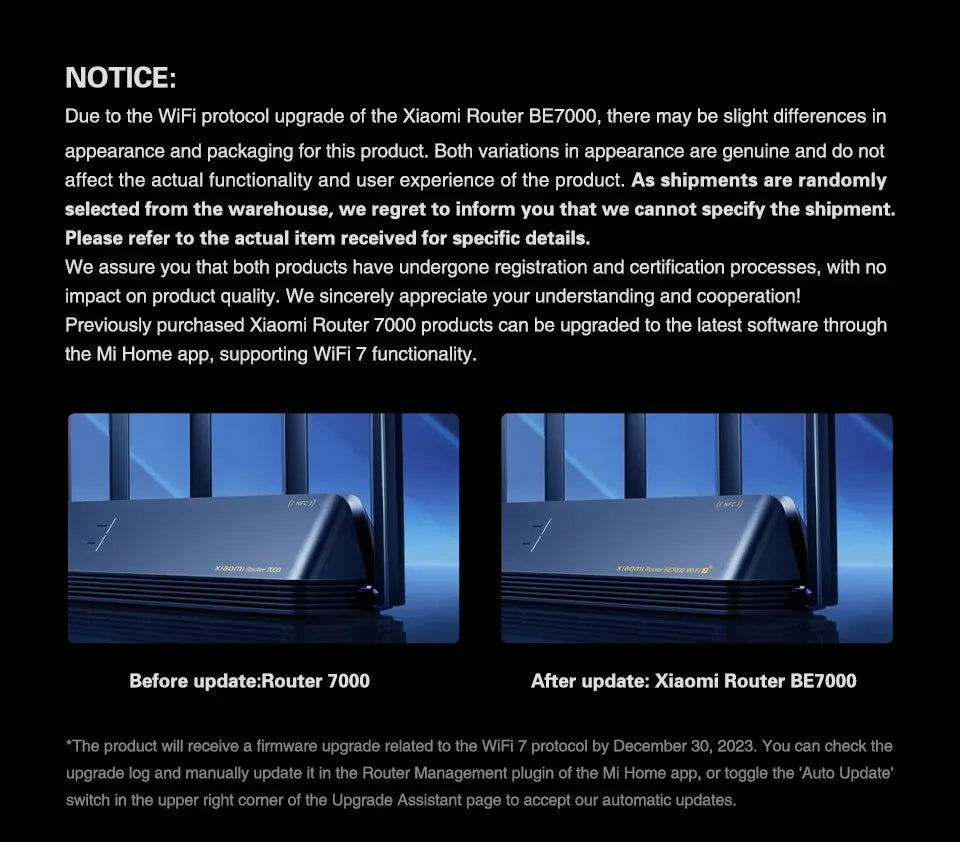 *The product will receive a firmware upgrade related to the WiFi 7 protocol by December 30, 2023. You can check the upgrade log and manually update it in the Router Management plugin of the Mi Home app, or toggle the 'Auto Update' switch in the upper right corner of the Upgrade Assistant page to accept our automatic updates.
