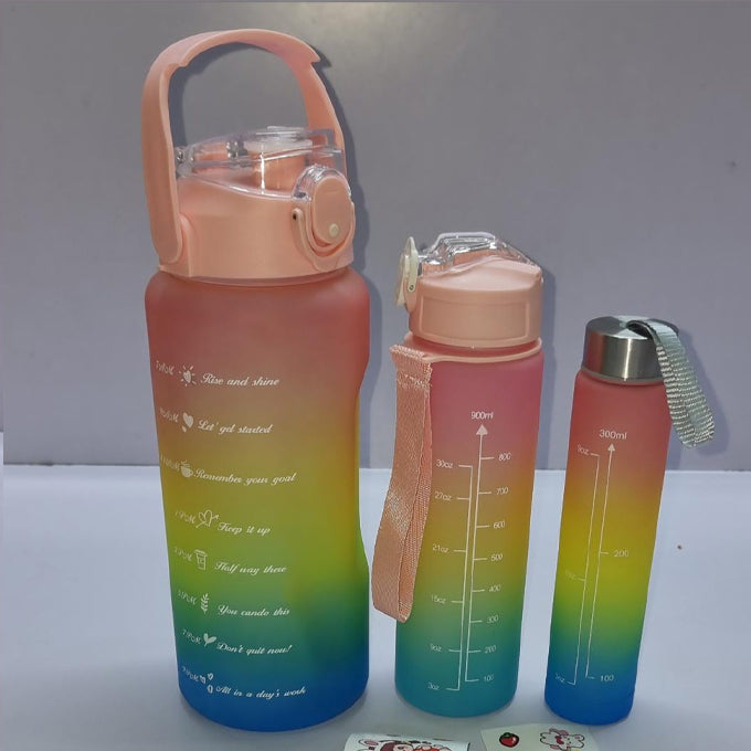 - Hydration Made Easy - Stay hydrated throughout the day with our 3-piece gradient water bottle set, featuring motivational quotes and easy-to-read capacity markers on the back. The trio of bottles (one large, two small) ensures you never go thirsty on the go. Note: Three water bottles are nested together and two small one is inside the big one.