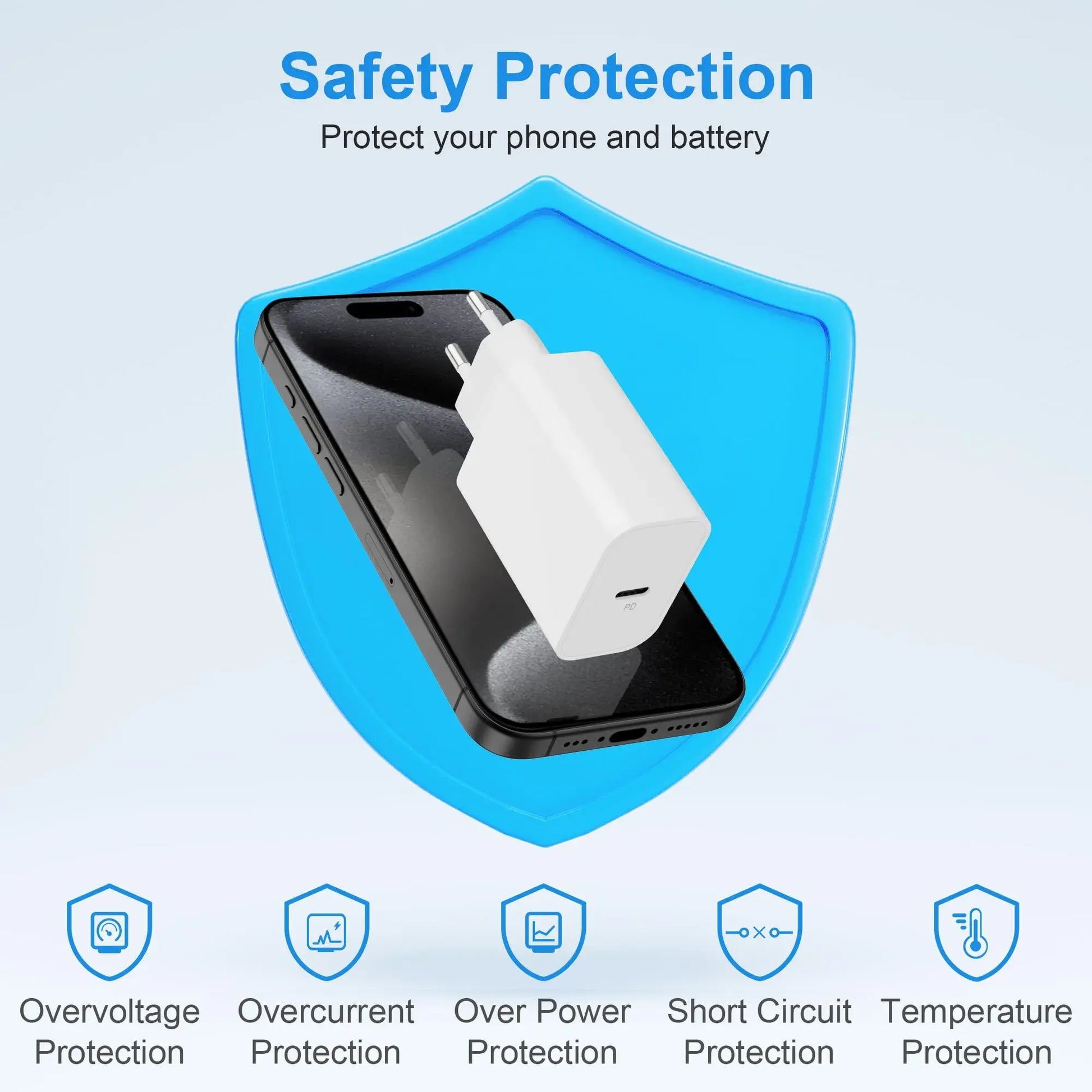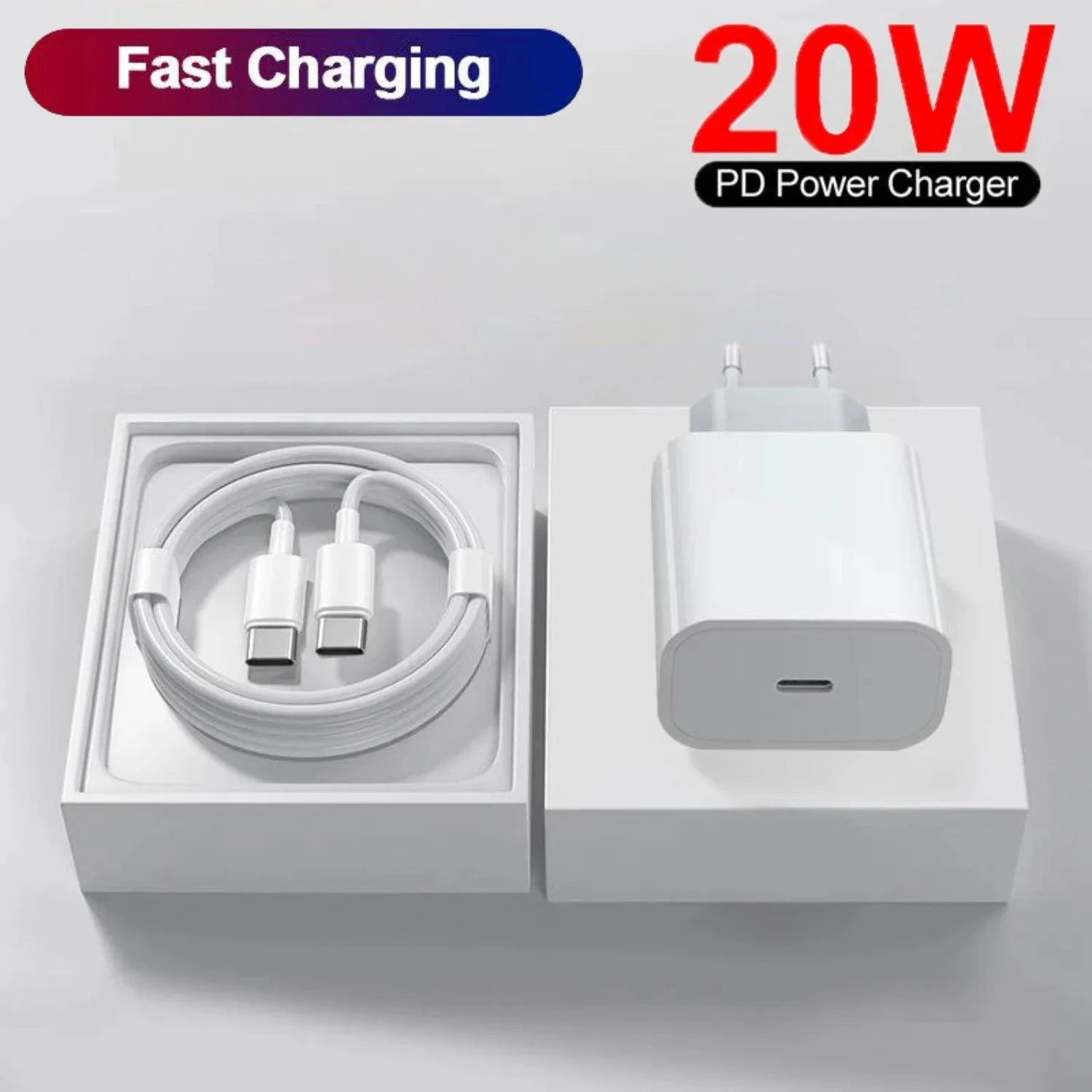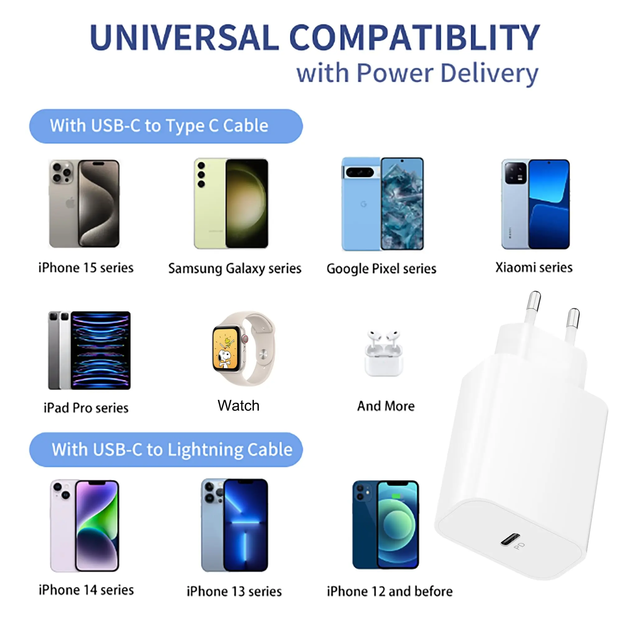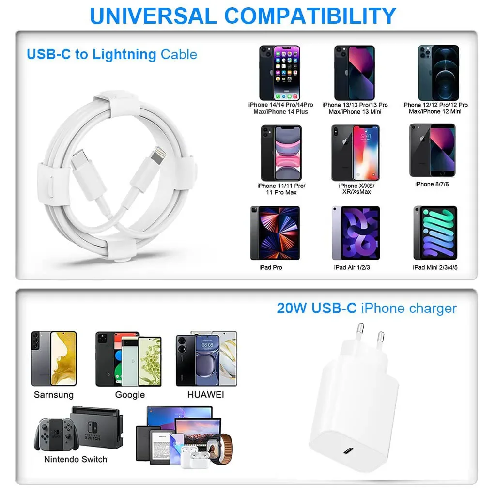 PD 20W Fast Charging EU Charger Plug with 1M/3FT Cable for iPhone iPad Samsung Phone