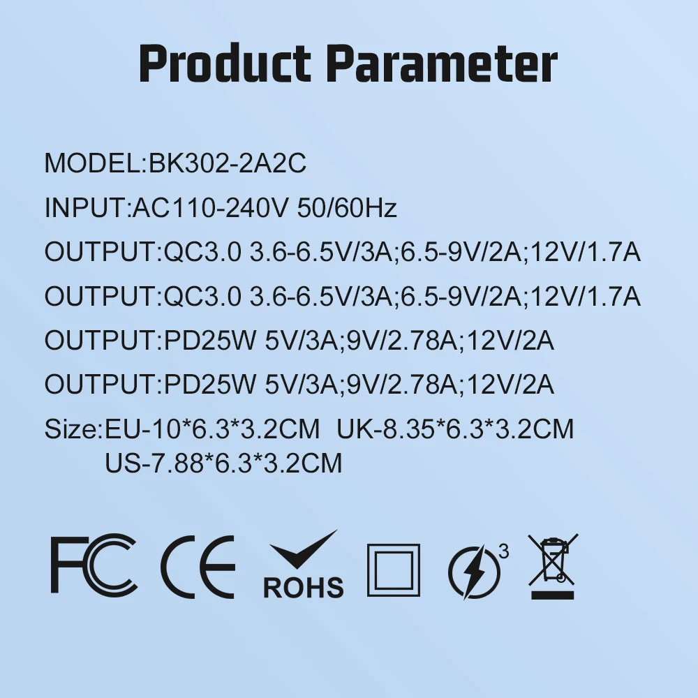Output: PD25W: 5V/3A; 9V/2.78A; 12V/2A