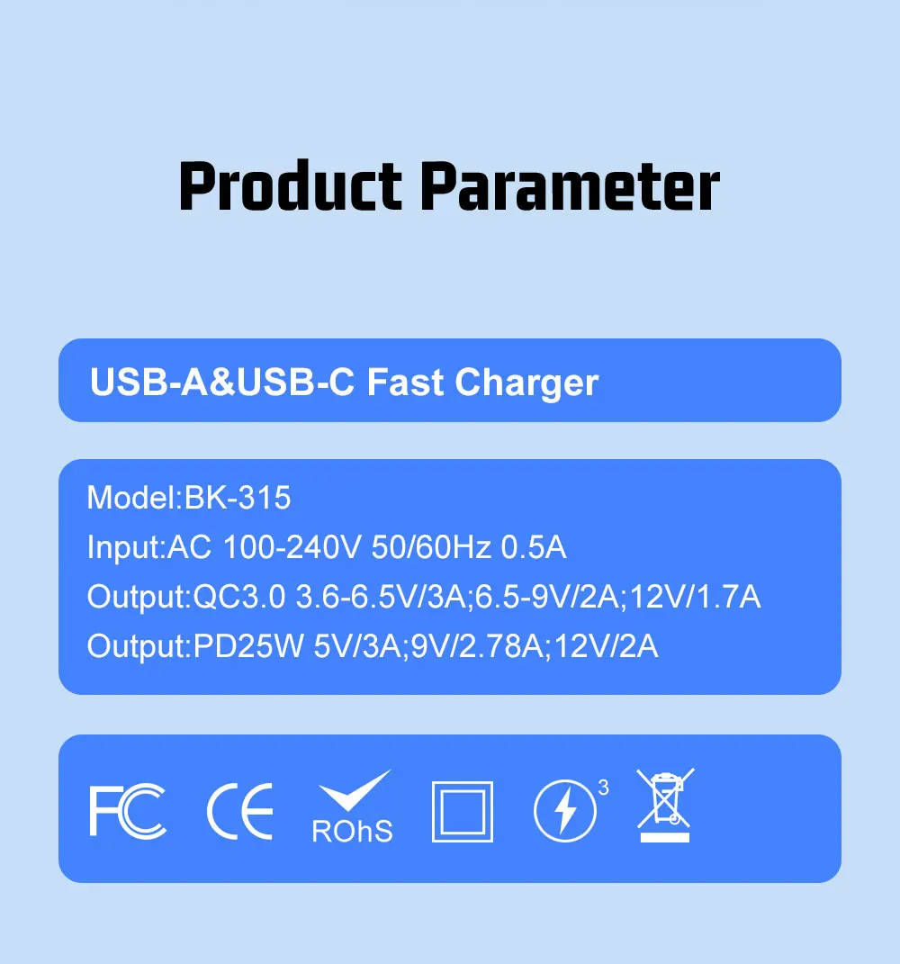 Output: PD25W: 5V/3A; 9V/2.78A; 12V/1.2A