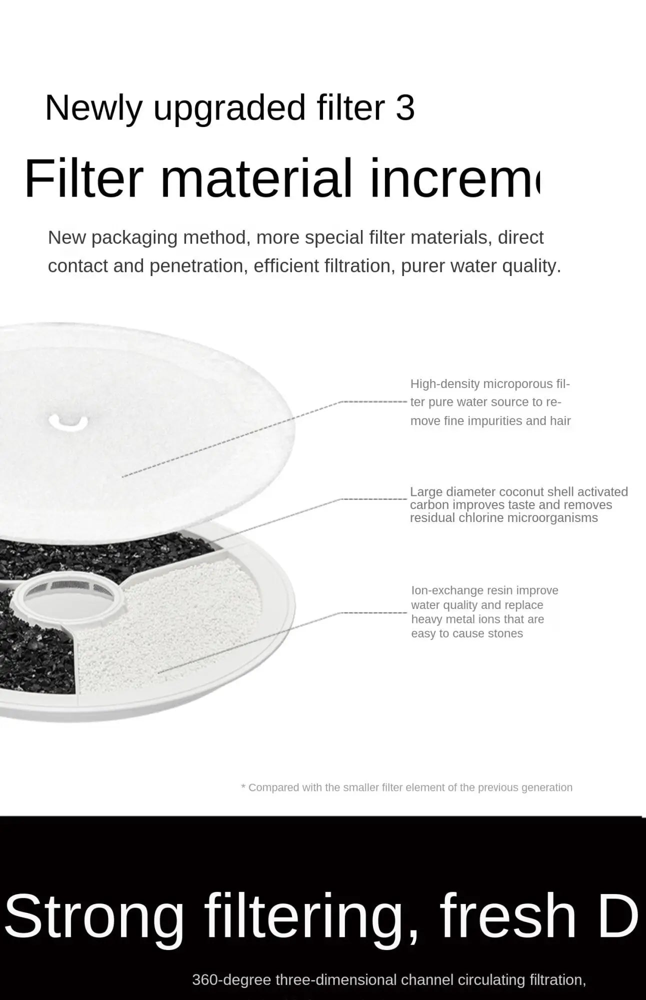 To prevent the activated carbon dust from shedding into water, please soak the cat fountain filter in water for 10 minutes then rinse thoroughly under running water before using. Replace every 1 to 2 weeks in summer and 2 to 4 weeks in winter. If multiple cats are using the fountain, more frequent replacement will be necessary. Please do not forget to reset the device, after replacing the filter.