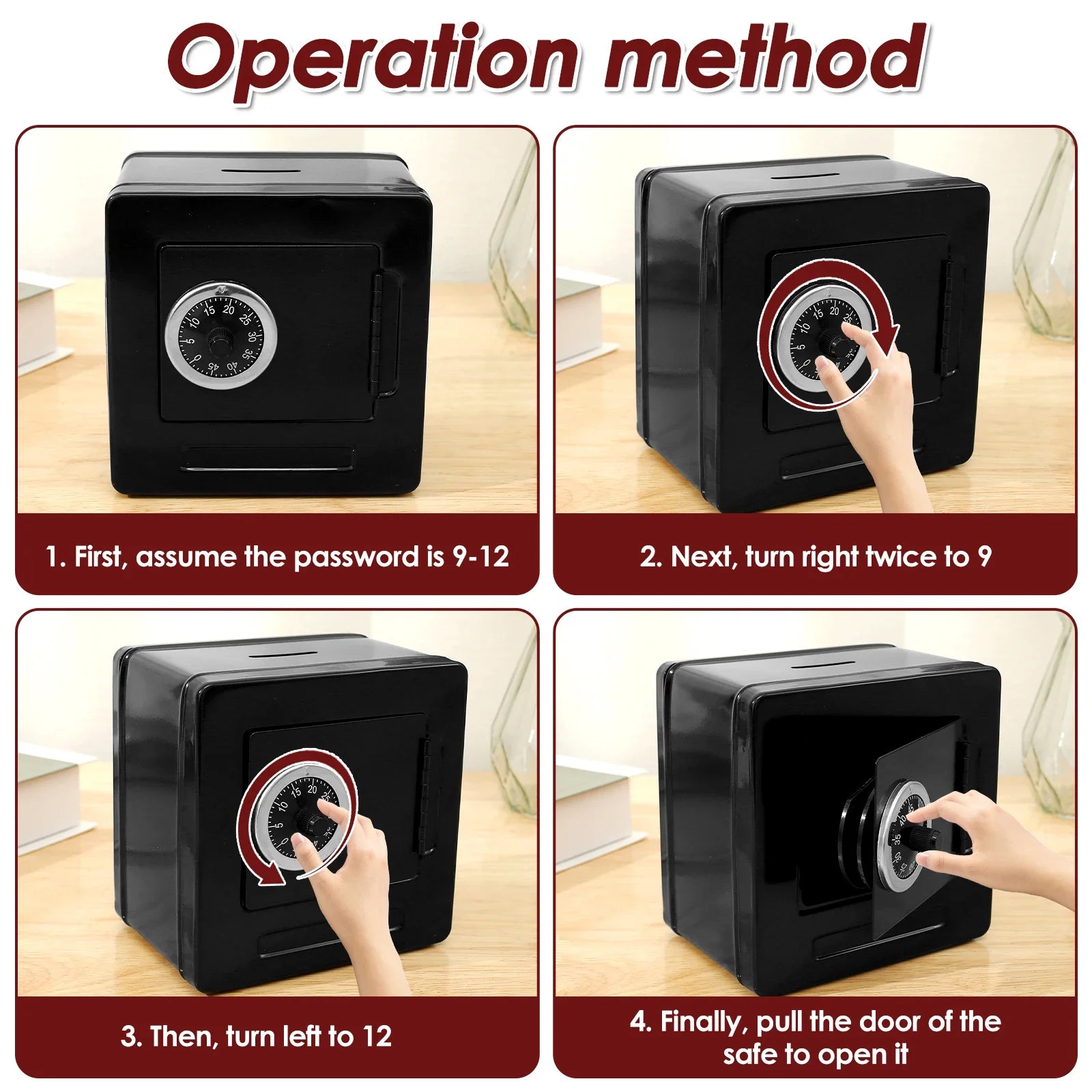 [Store Various Coins] With the coin slot design on the top of the money saving box, you can store a variety of coins, the capacity can hold up to 201 coins. (Combination Description: For example, the combination is 9-12. To unlock, turn right twice to 9, then left to 12, then gently pull on the door of the small safe to open it.)
