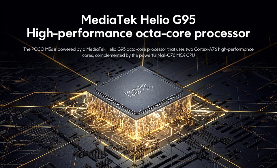 The POCO M5s is powered by a MediaTek Helio G95 octa-core processor that uses two Cortex-A76 high-performance cores, complemented by the powerful Mali-G76 MC4 GPU
