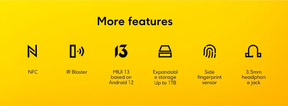 NFC | IR Blaster | MIUI 13 based on Android 12 | Expandable storage Up to 1TB | Side fingerprint sensor | 3.5mm headphone jack