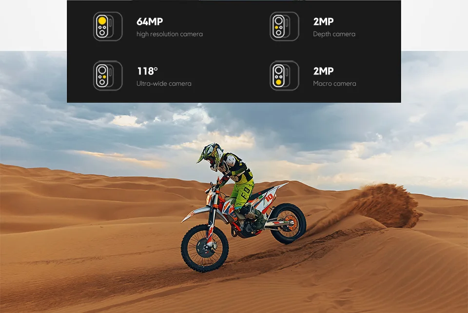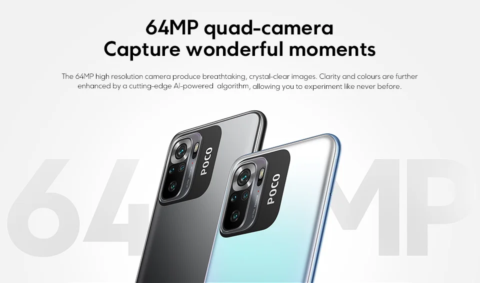 The 64MP high resolution camera produce breathtaking, crystal-clear images. Clarity and colours are further enhanced by a cutting-edge AI-powered algorithm, allowing you to experiment like never before.