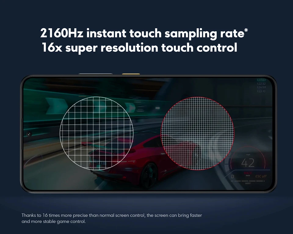 *2160Hz instant touch sampling rate supports only with Game Turbo mode on. 2160Hz instant touch sampling rate function will be available thru OTA as soon as possible, actual results may vary.