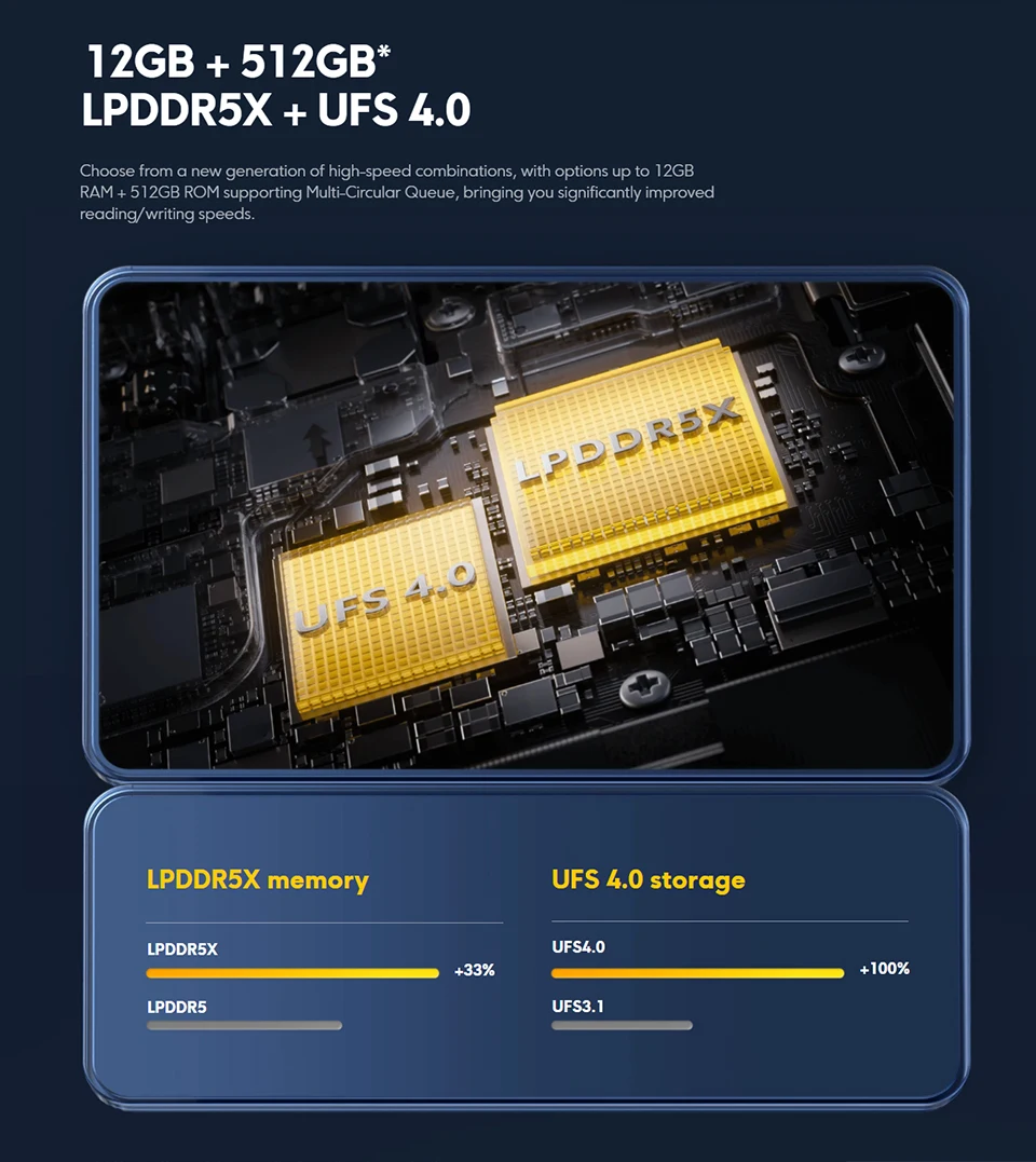 Choose from a new generation of high-speed combinations, with options up to 12GB RAM + 512GB ROM supporting Multi-Circular Queue, bringing you significantly improved reading/writing speeds.