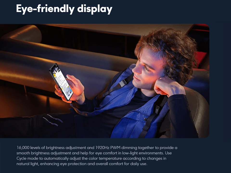 The display dynamically adjusts to video content and screen brightness to ensure a comfortable viewing experience and vivid details in different lighting conditions.