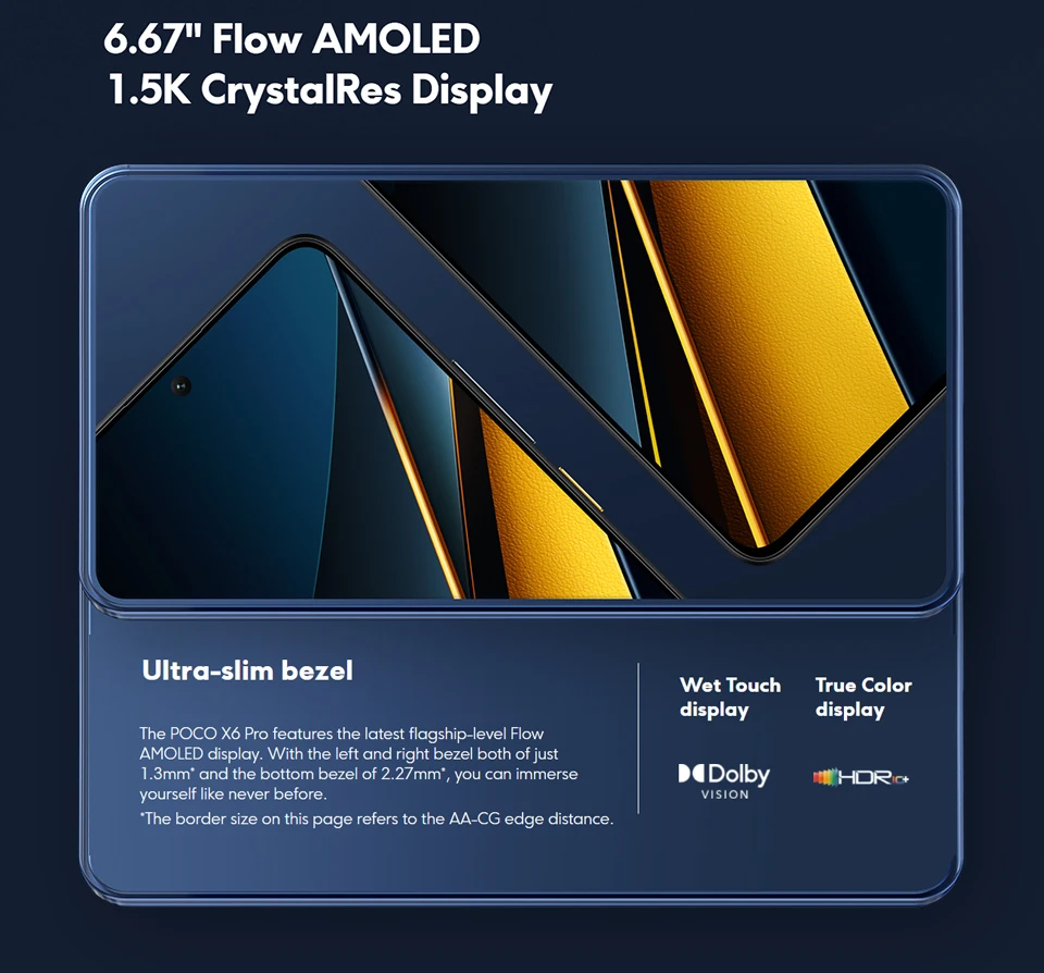 The POCO X6 Pro features the latest flagship-level Flow AMOLED display. With the left and right bezel both of just 1.3mm* and the bottom bezel of 2.27mm*, you can immerse yourself like never before.