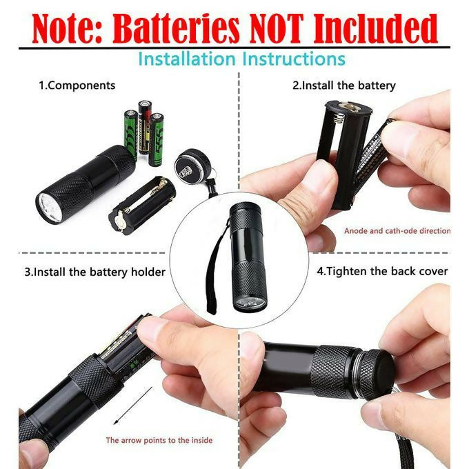 - Attention: Do not look at the flashlight directly with naked eyes, Direct exposure to UV flashlight are harmful on the eyes.
