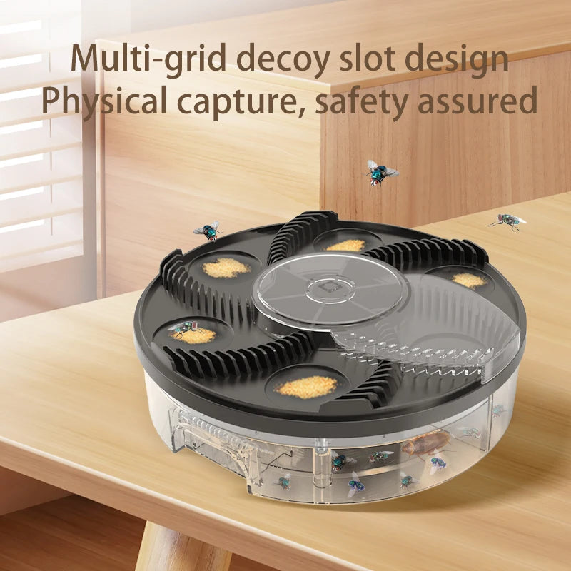 1.Catching Principle: sugar water or soft food crumbs are placed in 5 Insect food on the electric fly catcher; As the flies feast, the rotating arms sweep over them, trapping them inside; They fly into the collection tray and die a few days later; Pull off the bottom to empty the tray