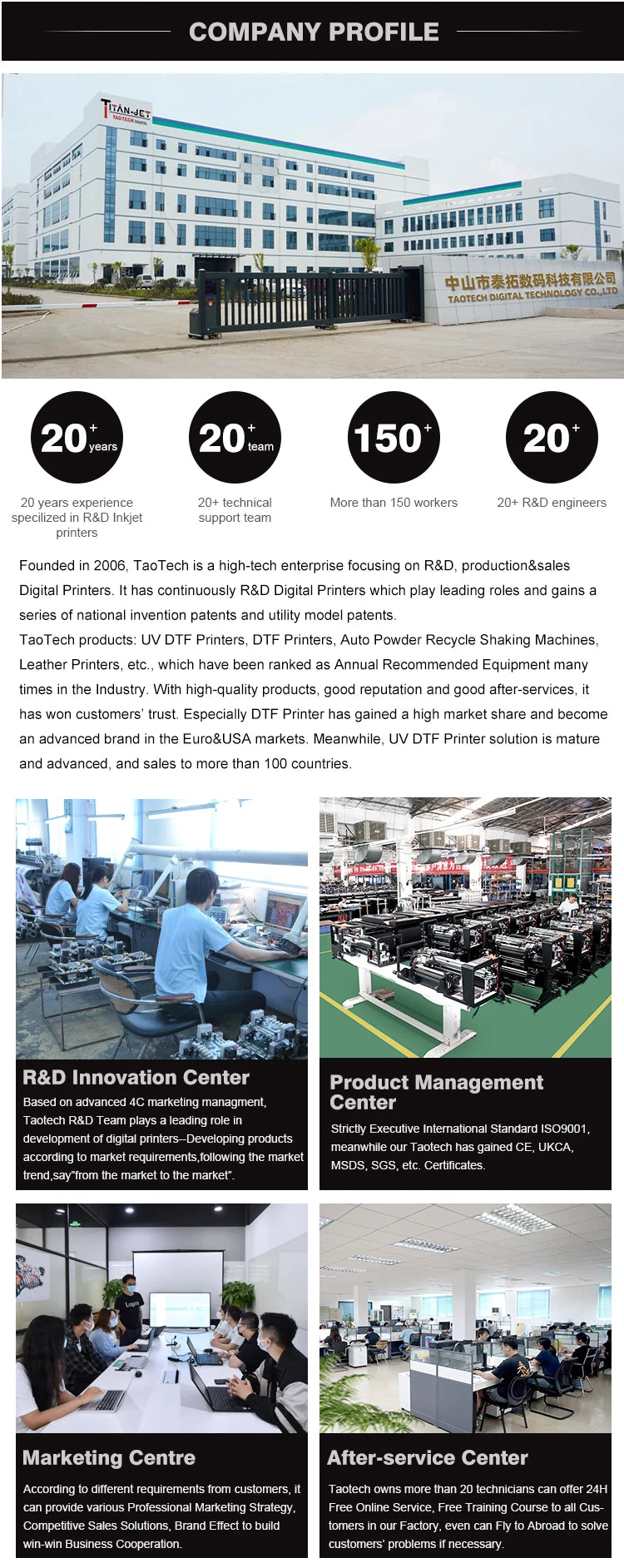 Founded in 2006, TaoTech has been focusingon R&D, production and selling digital inkjet printers in various of industry applications.