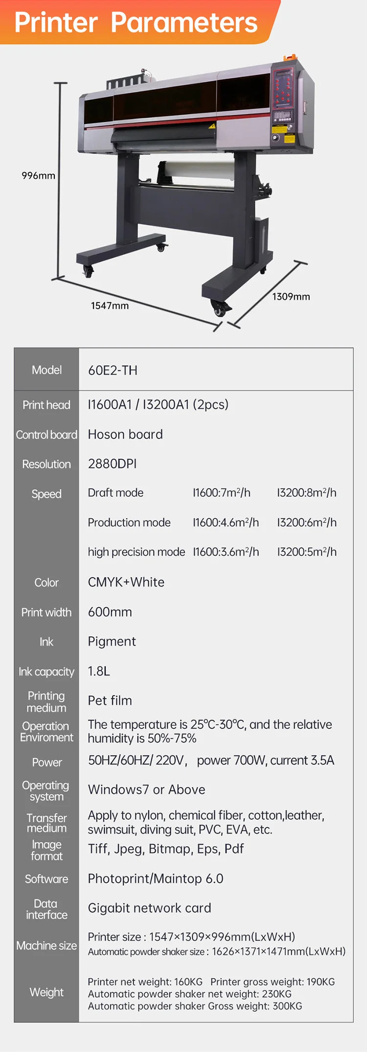 Printer size:1547x1309x996mm(LxWxH)