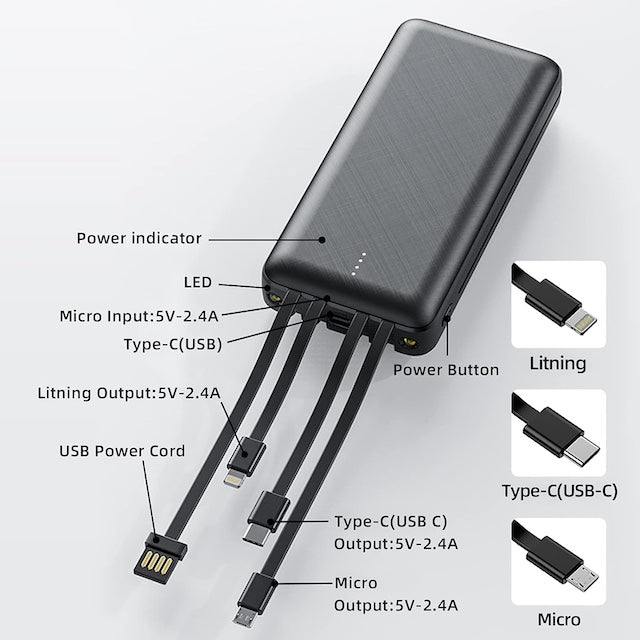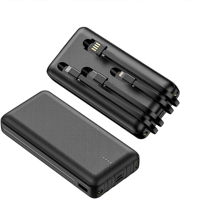 - Versatile Charging Options: In addition to the built-in cable, this power bank features two standard USB ports, allowing you to charge multiple devices simultaneously. This versatility is especially handy when you need to power up multiple gadgets or help a friend in need.