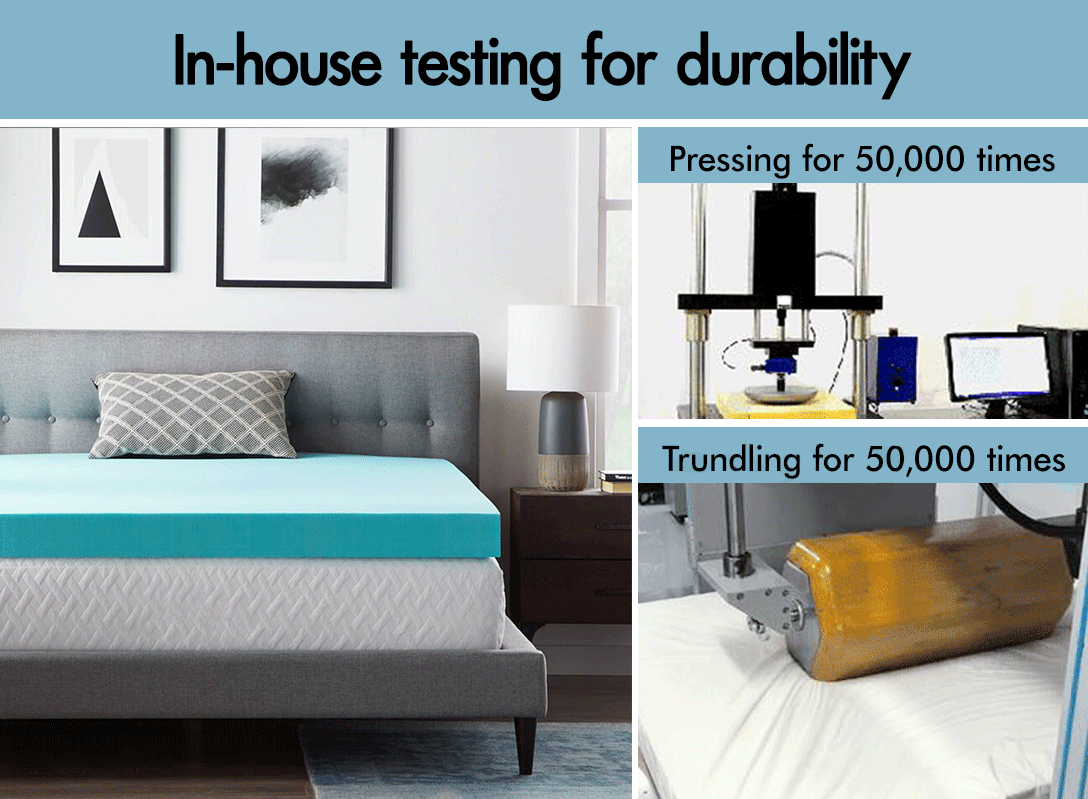 We carry out compulsory in-house testing for each batch of our toppers to ensure its durability and elasticity, it is a testing of Pressing 50,000 times and Trundling 50,000 times. And our toppers are certified by OEKO-Tex, SGS, BSCI and CE.