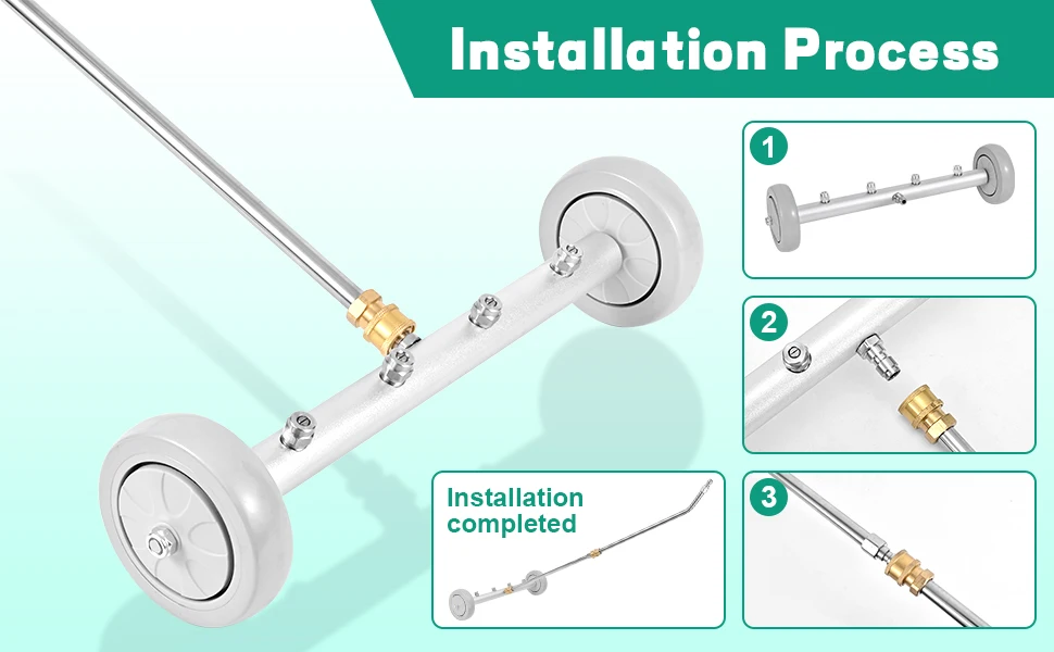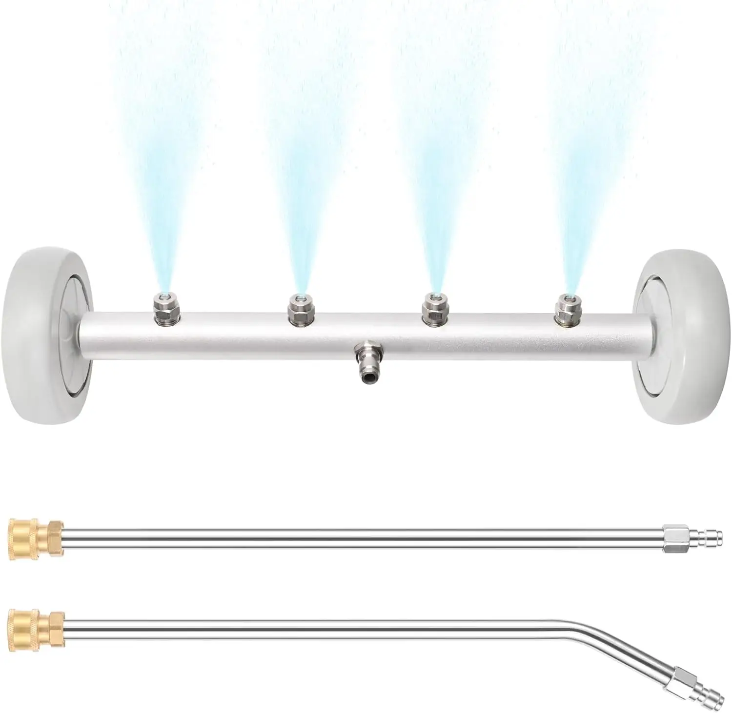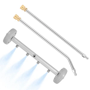 High-pressure washer undercarriage cleaner consists of 4 self-replaceable nozzle accessories and 2 casters.