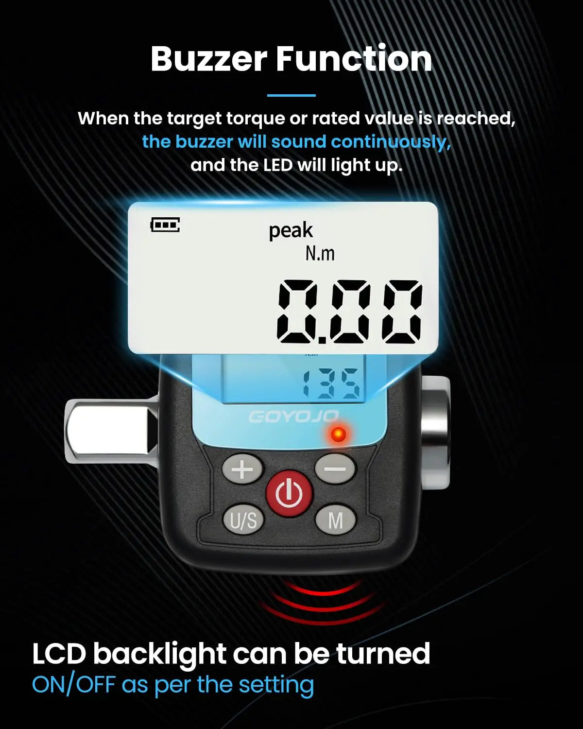 ILLUMINATED LCD FOR EASY READING: Our torque adapter features a crystal-clear LCD with a convenient backlight. Easily activate or deactivate the backlight by pressing the "+" and "power" buttons simultaneously, ensuring accurate torque readings in low-light or nighttime conditions with this user-friendly feature.