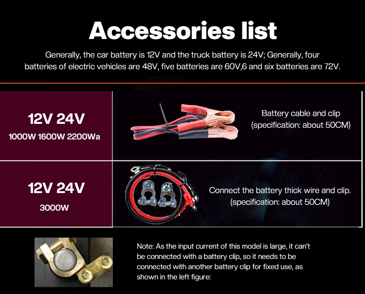 When 12V/24V is used to connect the cigarette lighter wire in the vehicle, please do not exceed 120W (12V in the vehicle) and 200W (24V truck)