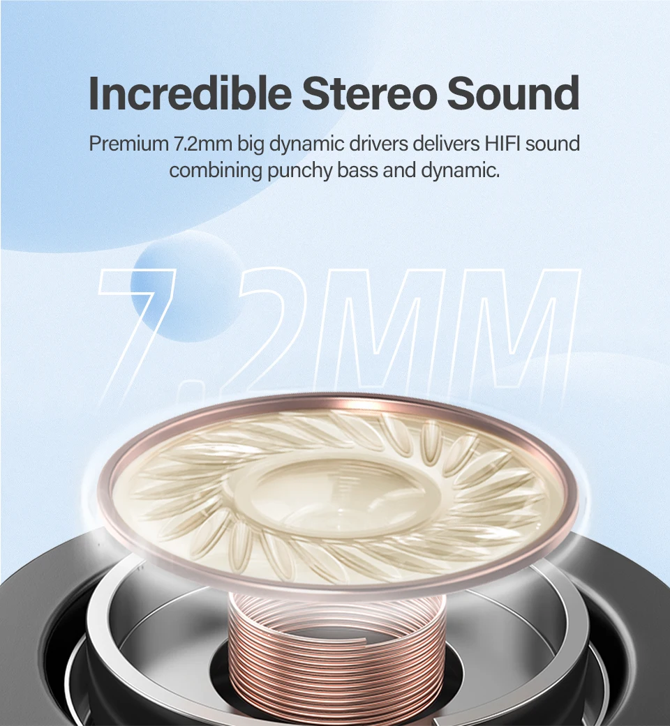 7.2mm driver delivers HIFI sound combining punchy bass and dynamic, transient analytic force.
