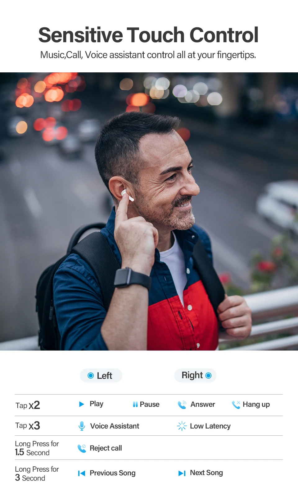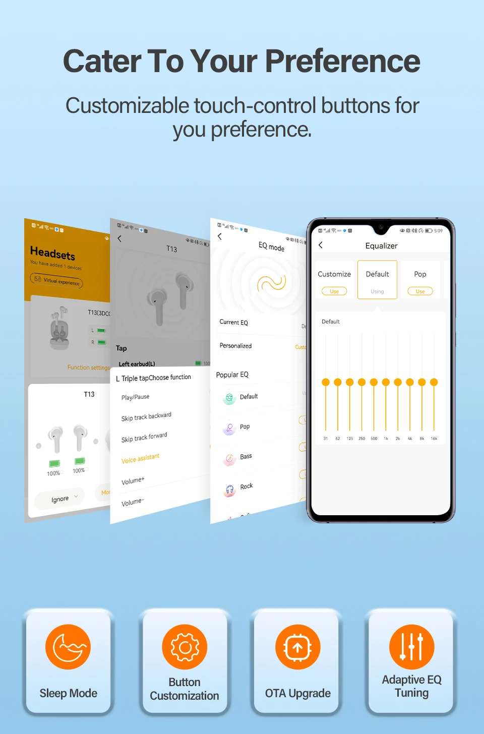 Customizable touch-control buttons for you preference. Except language change,default EQ modes and OTA firmware update,we add Sleep Mode to help you avoid any unintended activation.