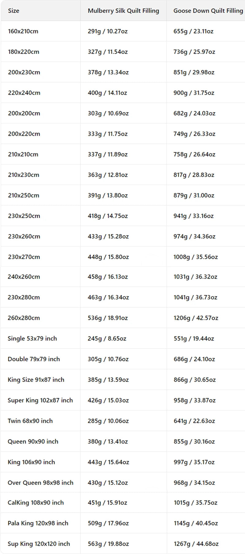 The numerical values following the dimensions refer to the weight of the quilt's filling material, not the total weight.