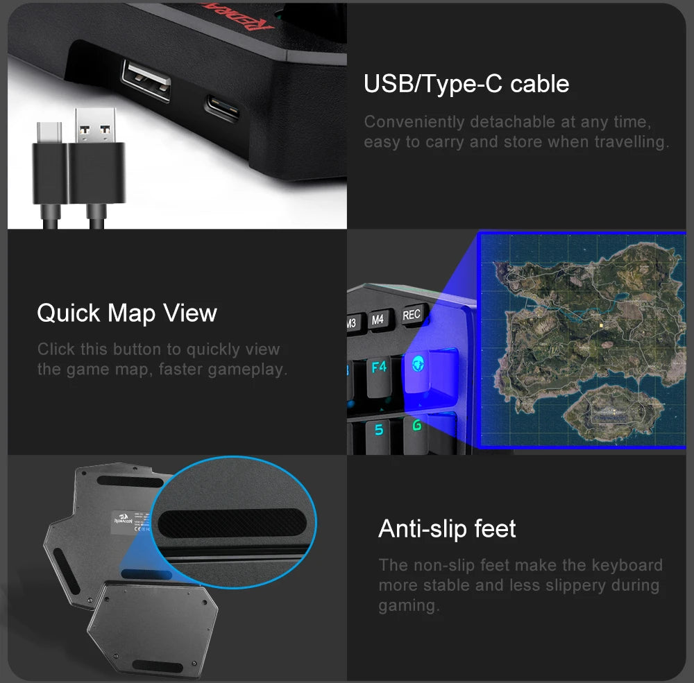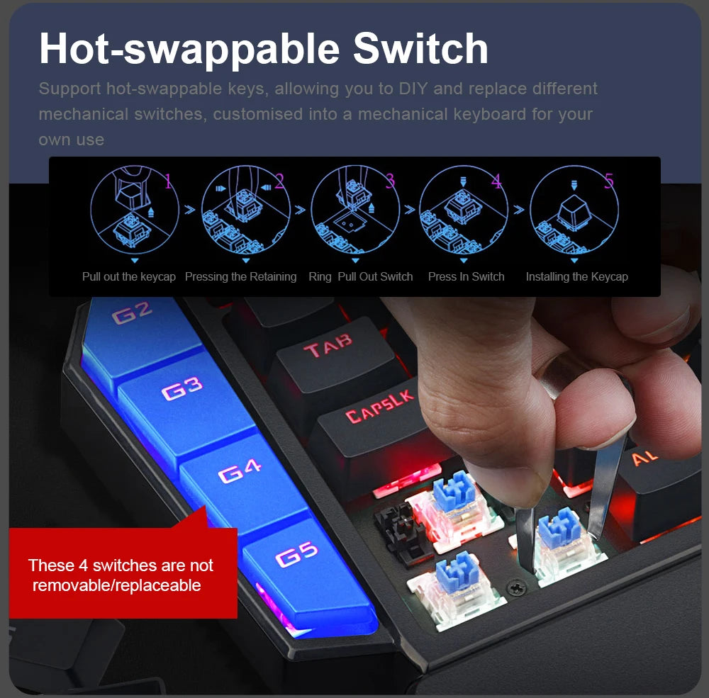 Upgraded Hot-Swap - The upgraded socket is now available on Redragon one-handed keyboard, with more ways to mod, and more fun.The iconic Redragon Blue Switches deliver audible clicky with clear tactile feedback, original mechanical feel.