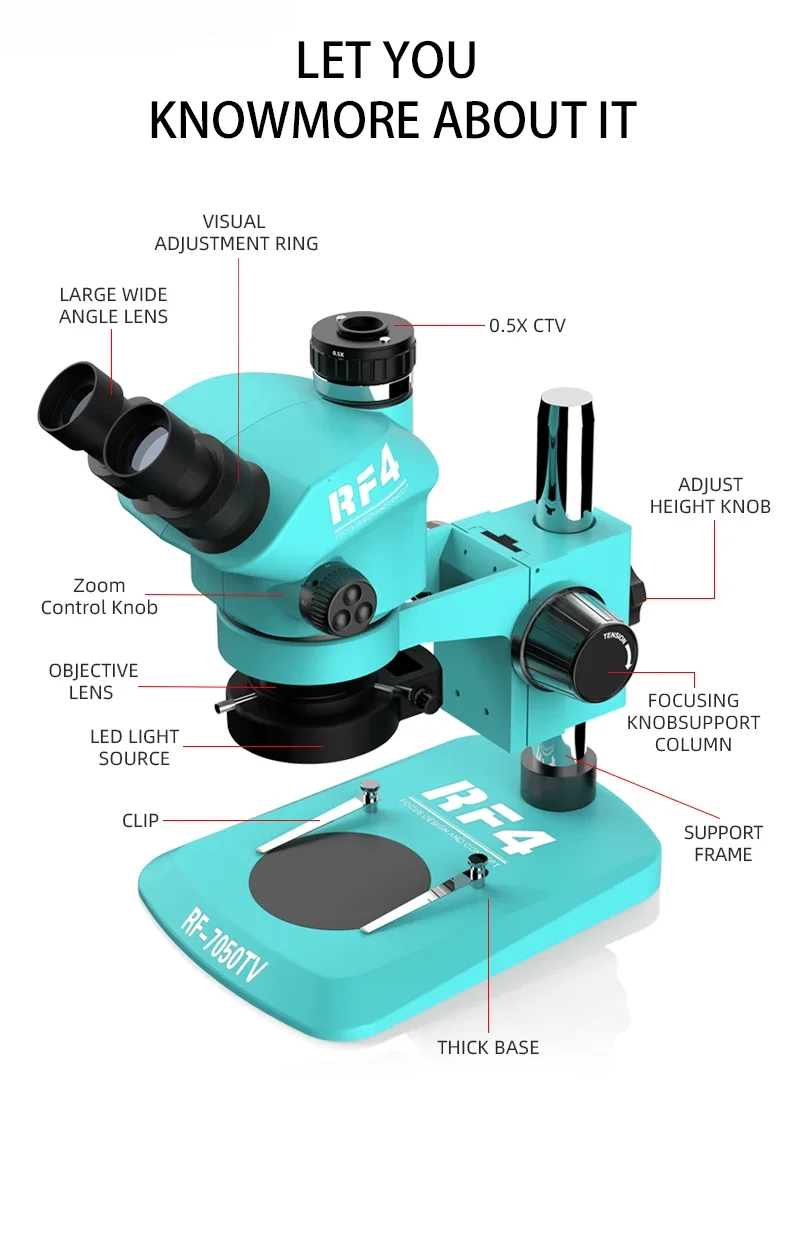RF4-7050TV Triocular Microscope Head 7-50X Continuous Zoom Stereo Microscope Eyepiece Mobile Phone PCB Welding Instrument