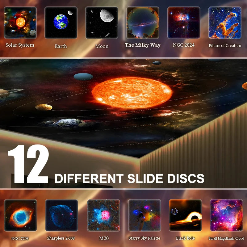 🚀【12 kinds of Filin film Projection Effect】Light Projector for Bedroom comes with 13 different 4k HD galaxy discs, including the Solar System, Earth, Moon, The Milky Way, Galaxy, Andromeda Galaxy, NGC4302-NGC4298, Hubble Deep Field, M60--UCD1, North America Nebula, Mystic Mountain, and Small Magellanic Cloud. These Realistic galaxy film discs taking you to experience an fantastic universe world. Perfect for kids, teen girls, adults bedroom decoration.