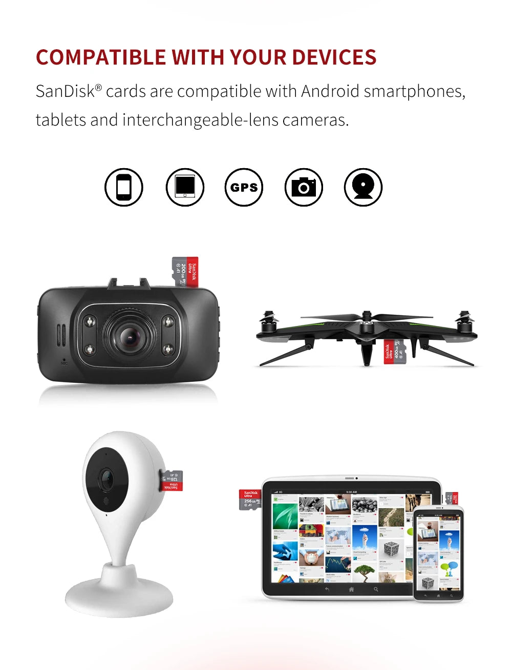 SanDisk cards are compatible with Android smartphones,tablets and interchangeable-lens cameras.