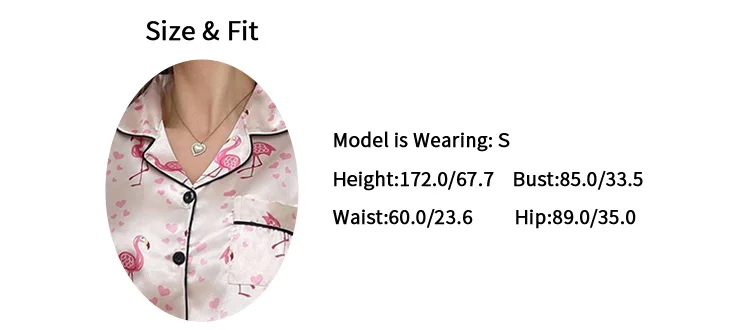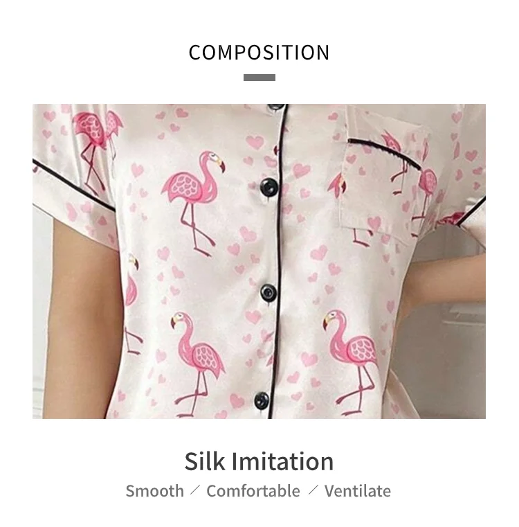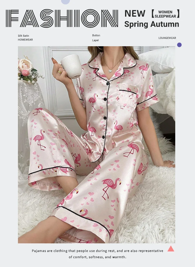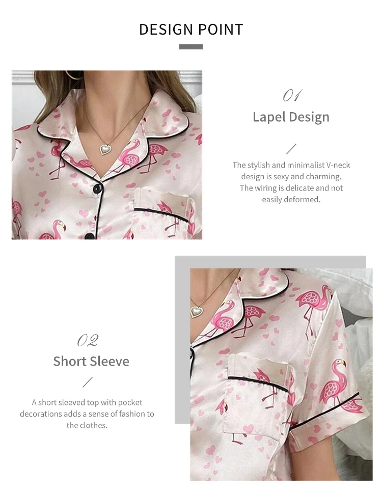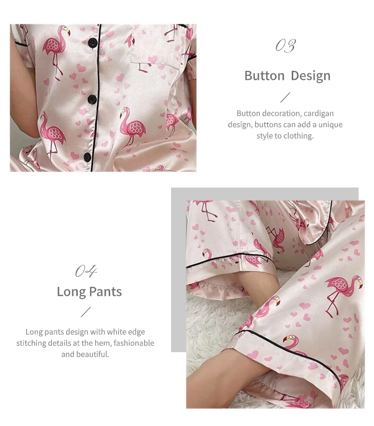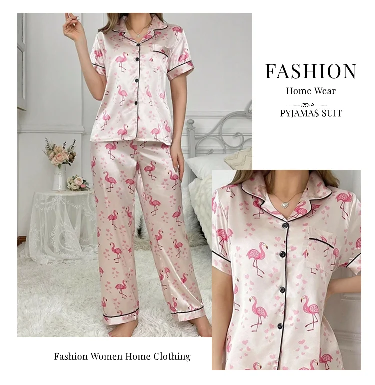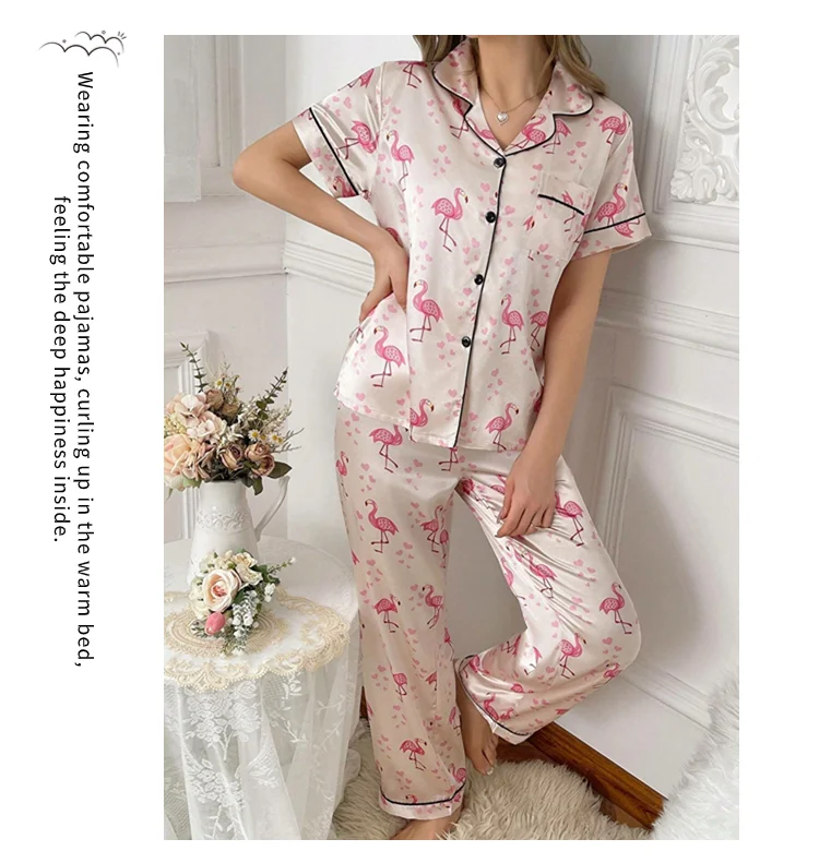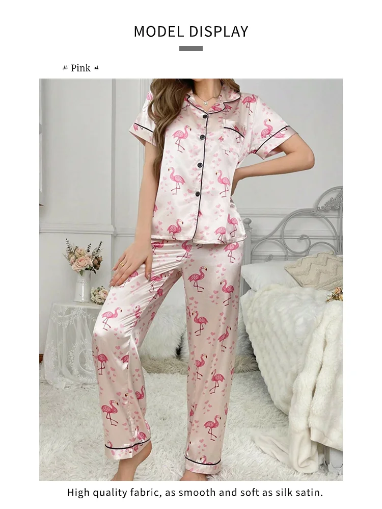 Satin Pajamas For Women Home Clothes Autumn Short Sleeve Turn-down Collar Tops Pants Sleepwear Flamingo Print Pyjama 2 Piece Set